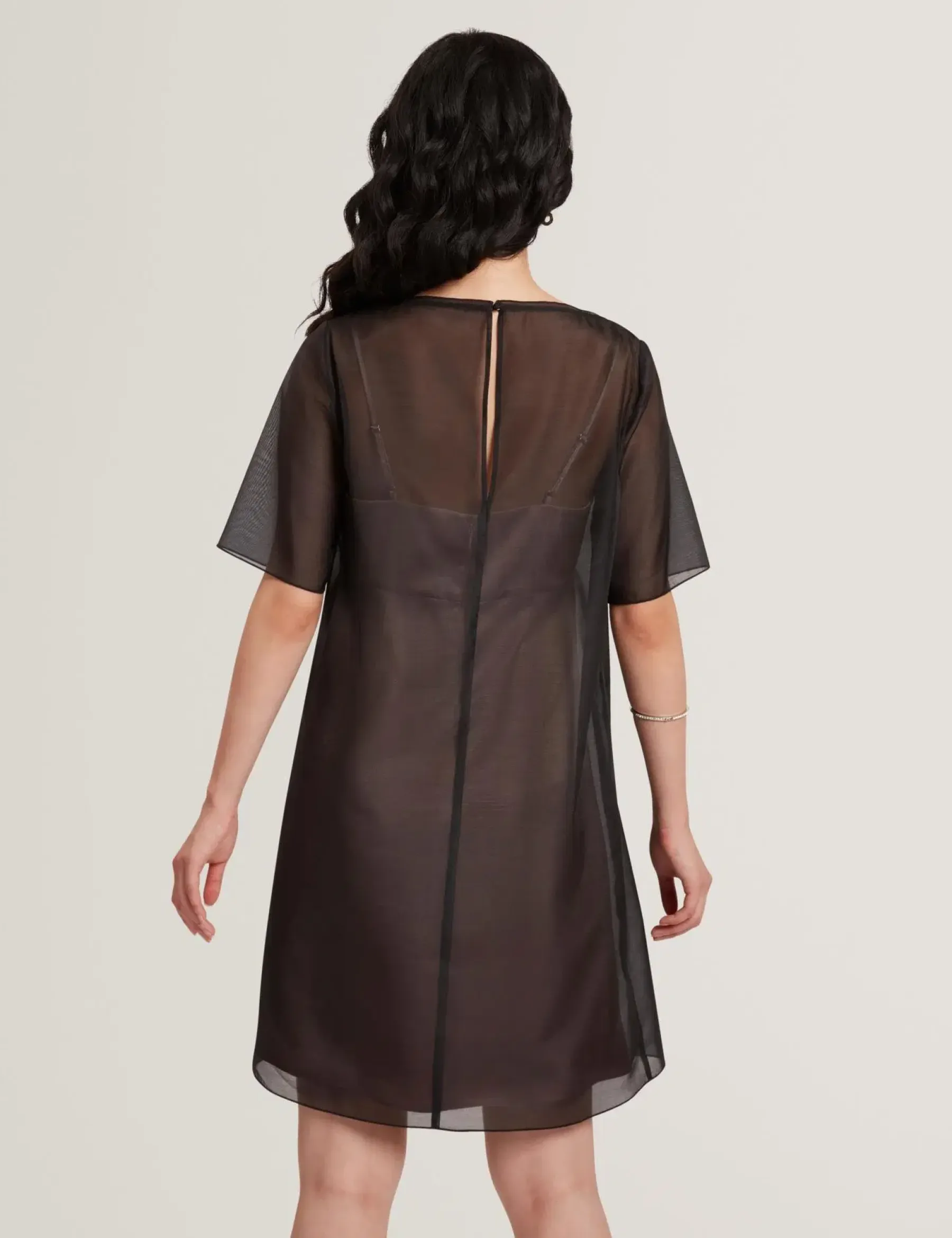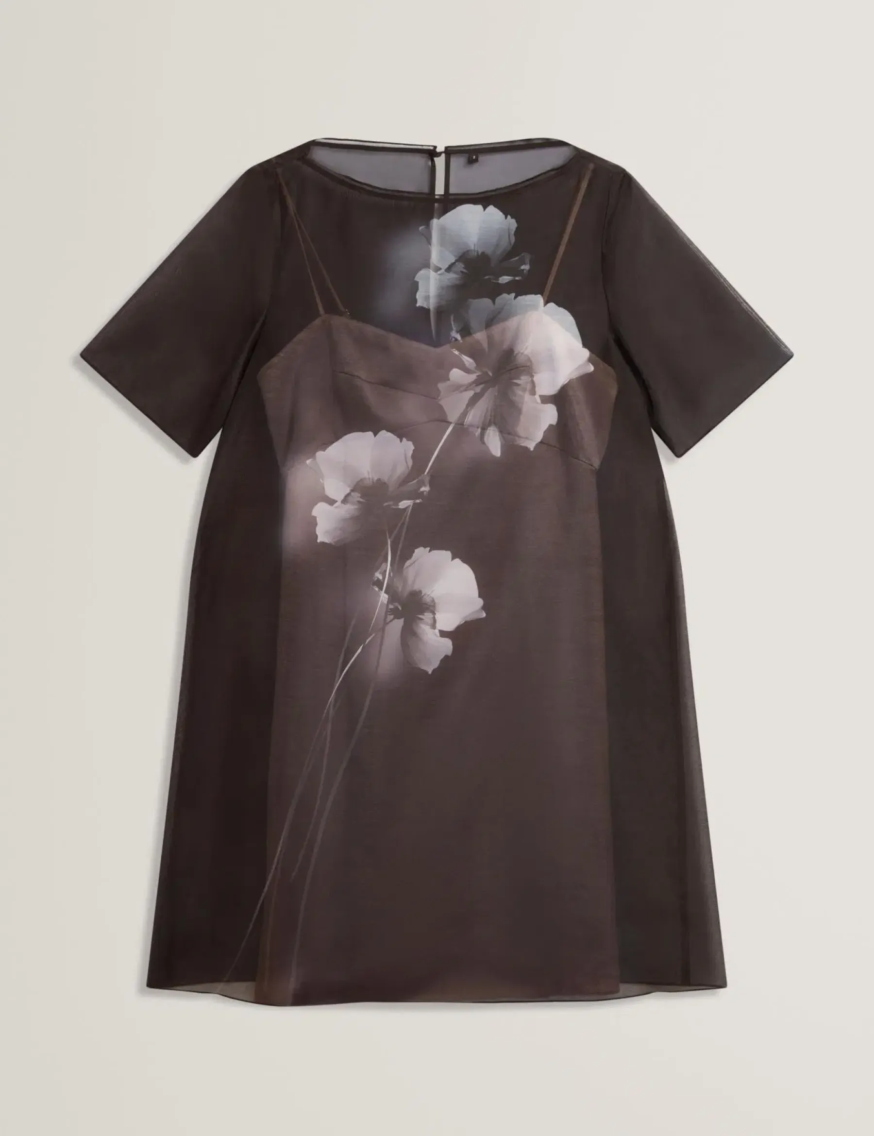 Kaunis organza kankainen mekko, jossa lyhyet hihat ja upea iso kukkaprintti edessä.