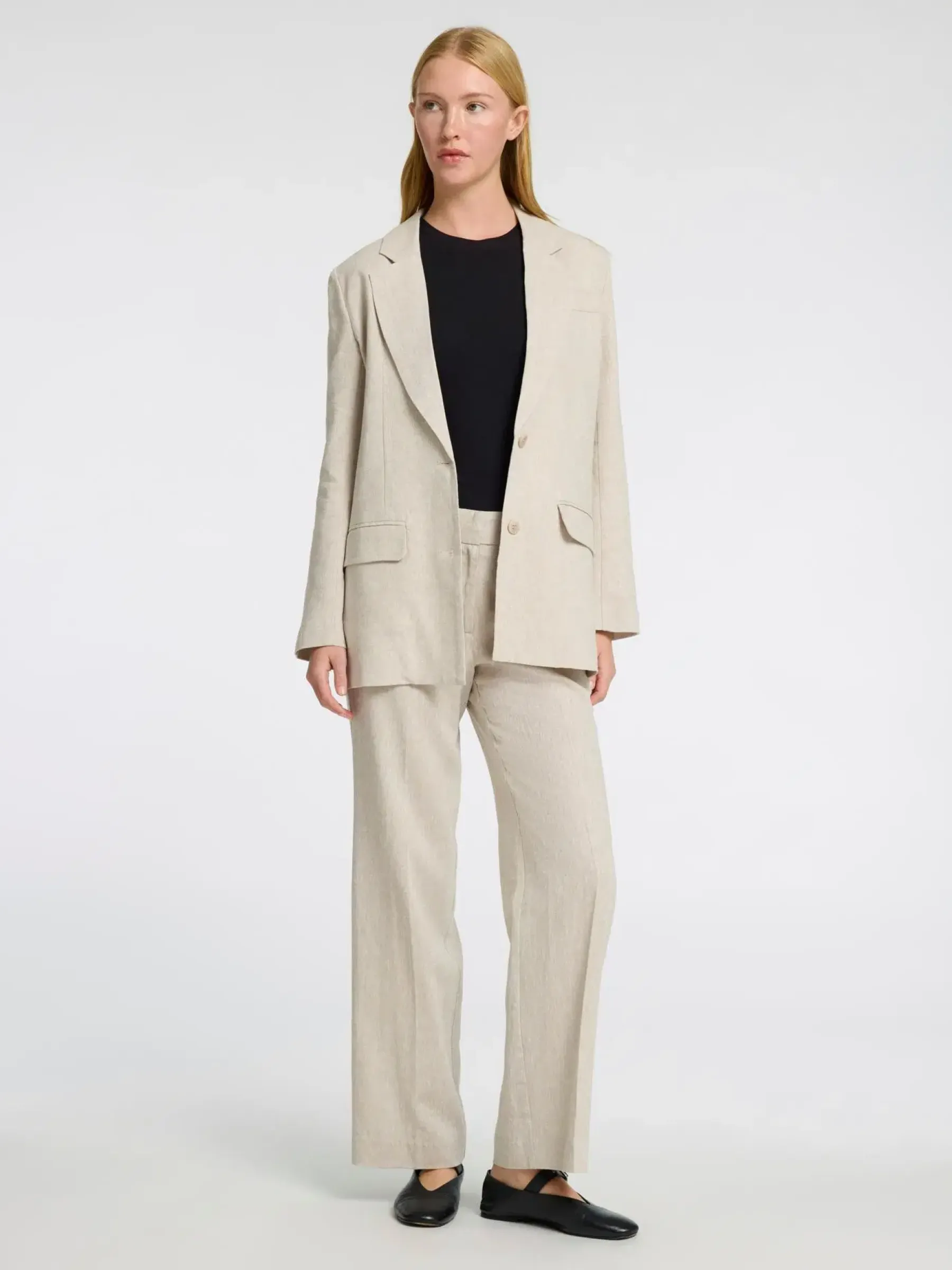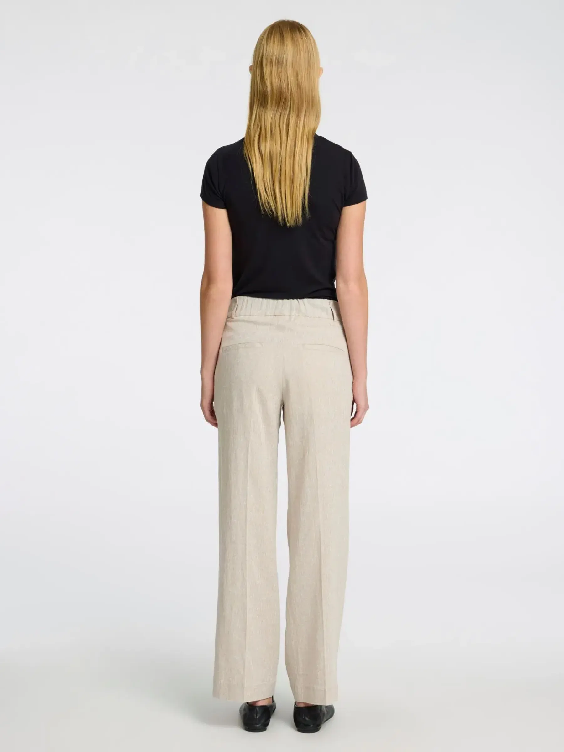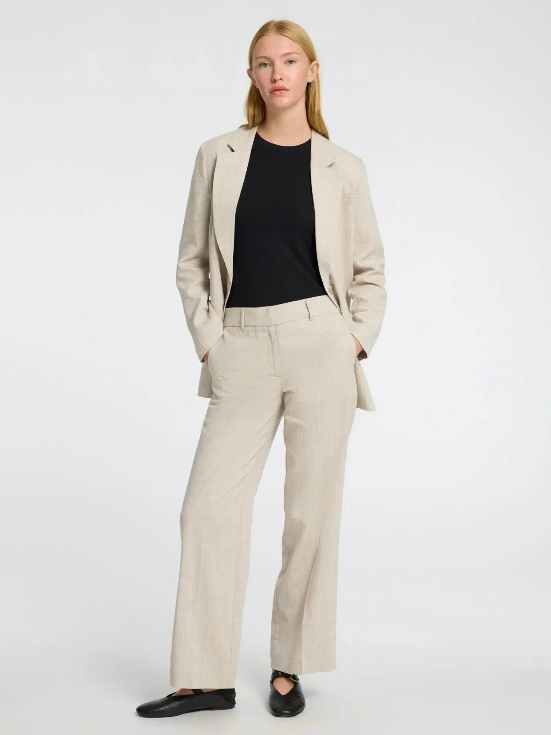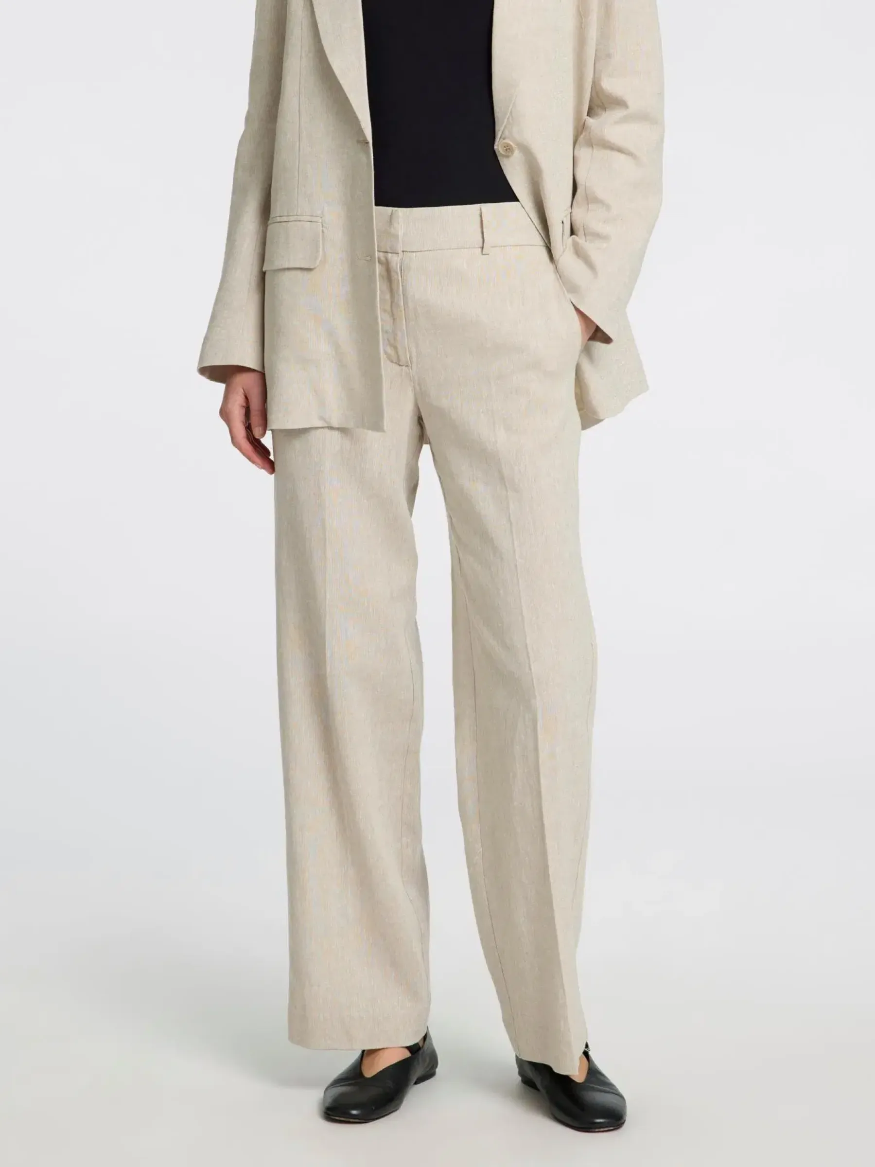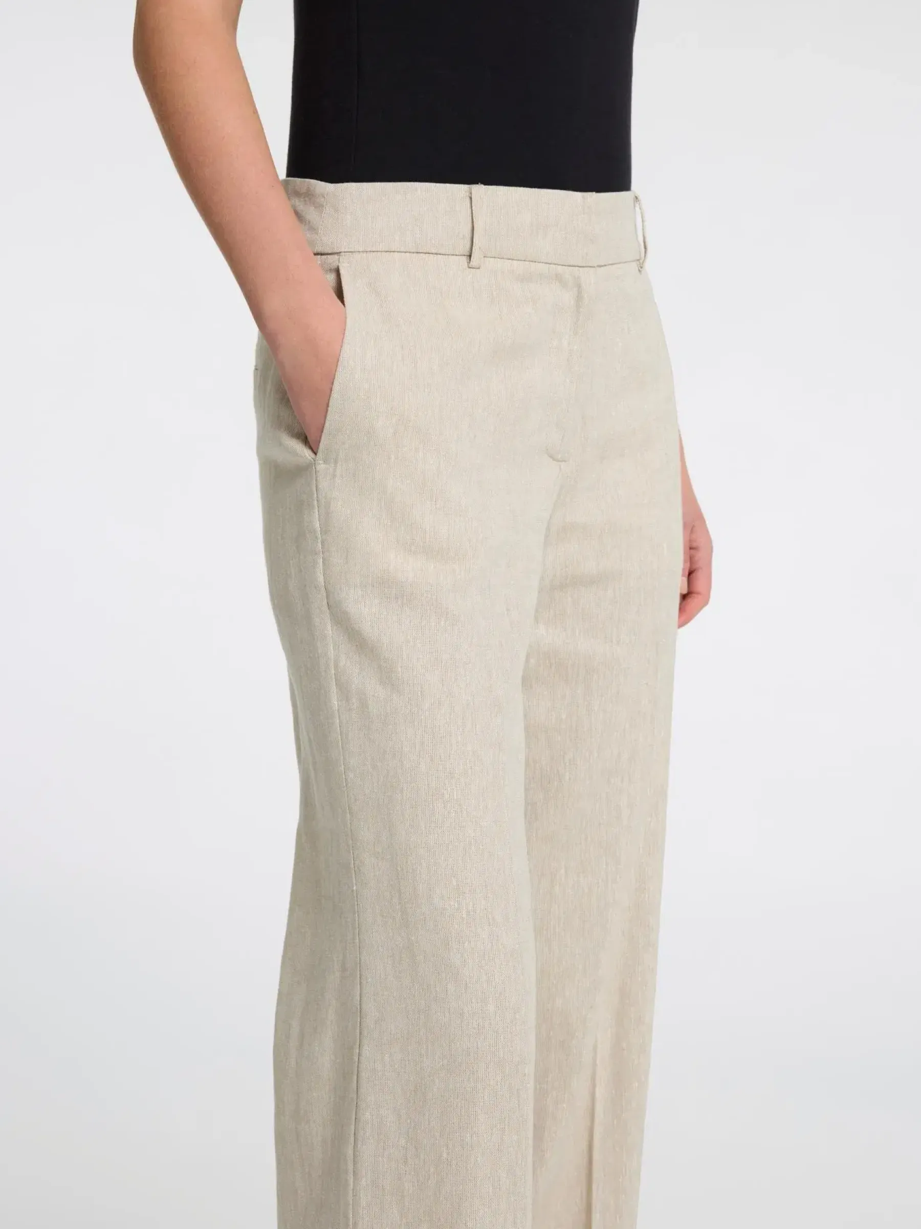 Normaalivyötäröiset, leveälahkeiset, siistit housut pellavasekoitteesta.