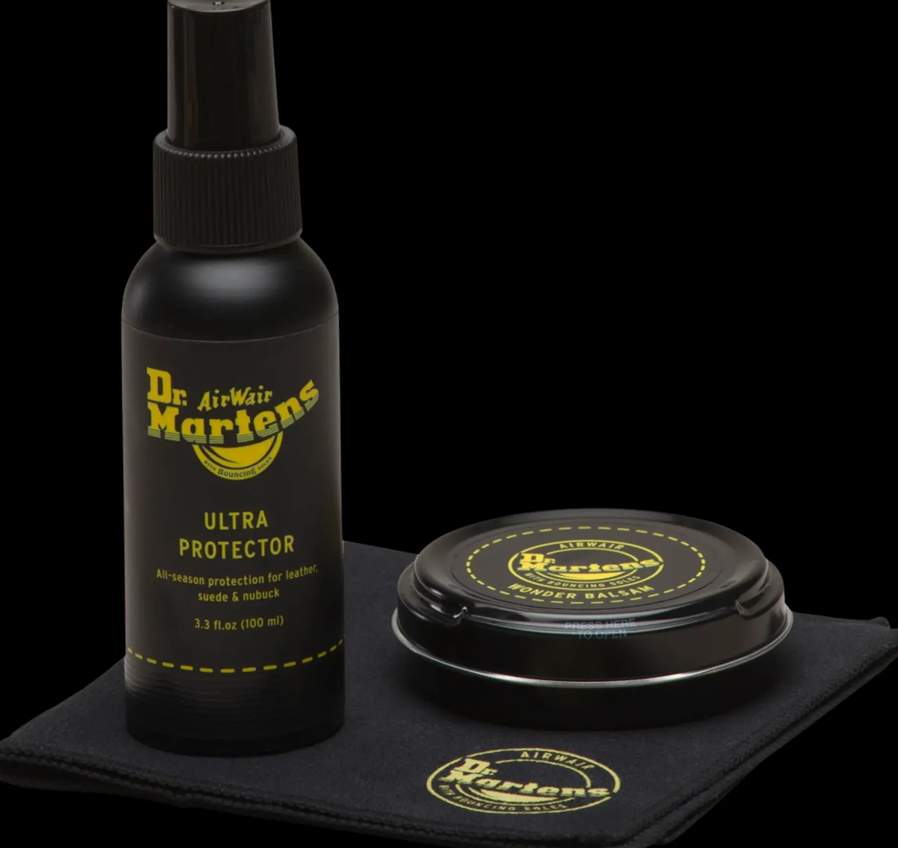 Dr. Martens kenkien hoitosetti nahkakengille. Setti sisältää Ultra protector suojasprayn (100ml), Wonder balsam nahanhoitotuotteen (50ml), sekä pehmeän liinan.