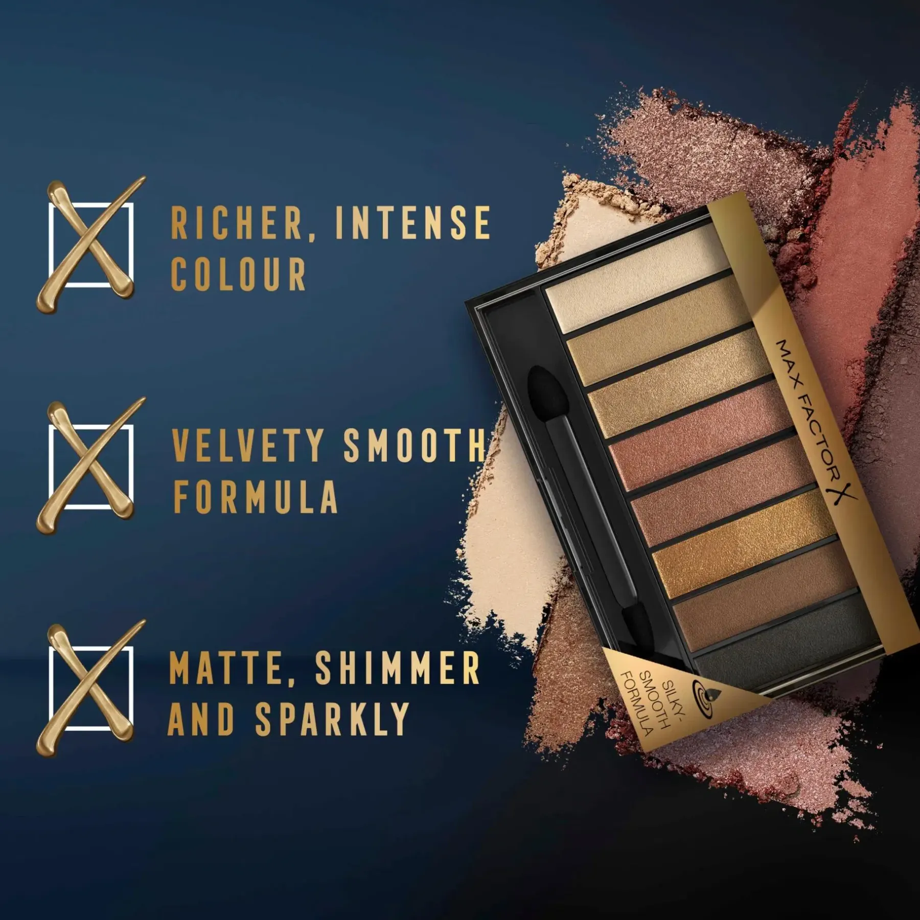 ”Kun haluat lisää syvyyttä ja useampia sävyjä luomillesi, valitse Masterpiece Nude Palette, jonka 8 eri sävyä antavat upean lopputuloksen. Vaikka paletissa on monta sävyä, se on silti kompaktin kokoinen kantaa esimerkiksi matkalla mukana. Runsaspigmenttiset, pitkäkestoiset ja helposti levitettävät värit luovat niin mattaisen, kuin kimaltavan lopputuloksen, jolloin voit tehdä aina tilanteeseen sopivan silmämeikin. Baked-powder koostumus on helppo työstää luomelle, eikä se karise tai suttaannu. Halutessasi lisää intensiivisyyttä väriin, voit kastella siveltimen ennen värin ottamista. Paletti on saatavana neljässä eri sävymaailmassa.