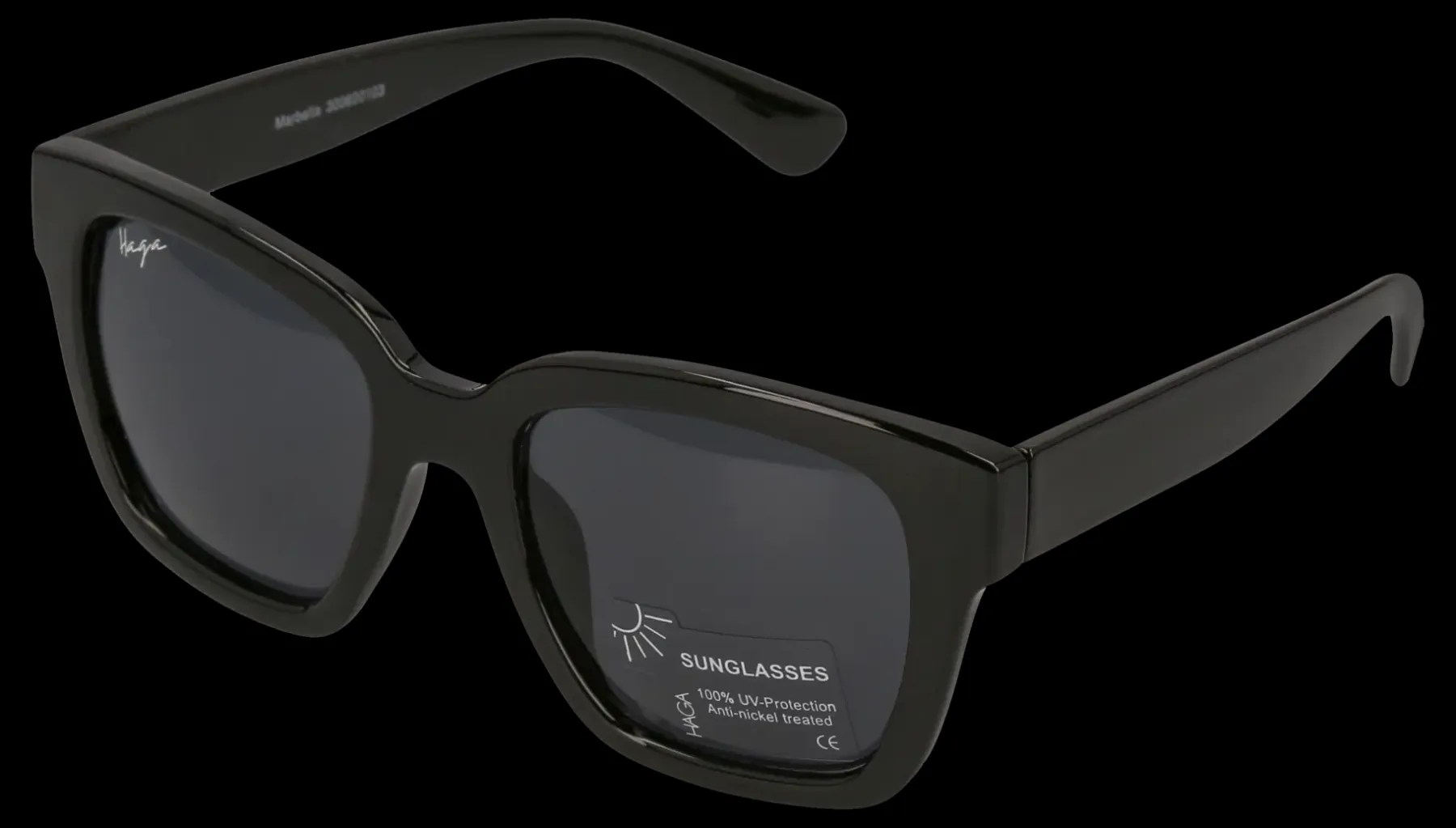 Ajattomat, naiselliset, isot mustat muovisankaiset aurinkolasit.