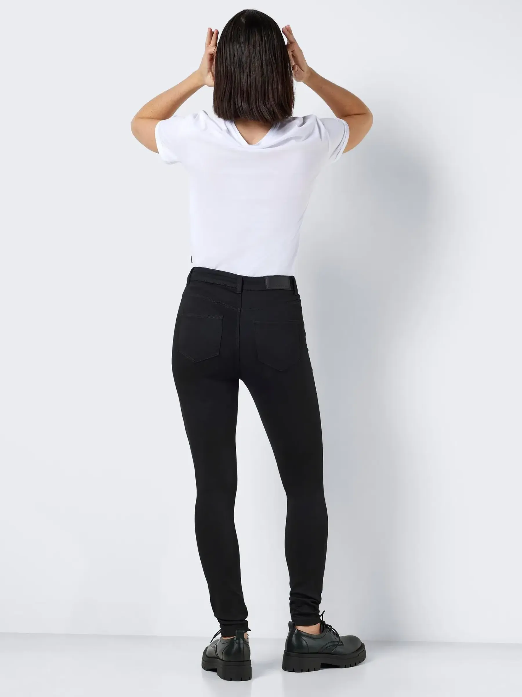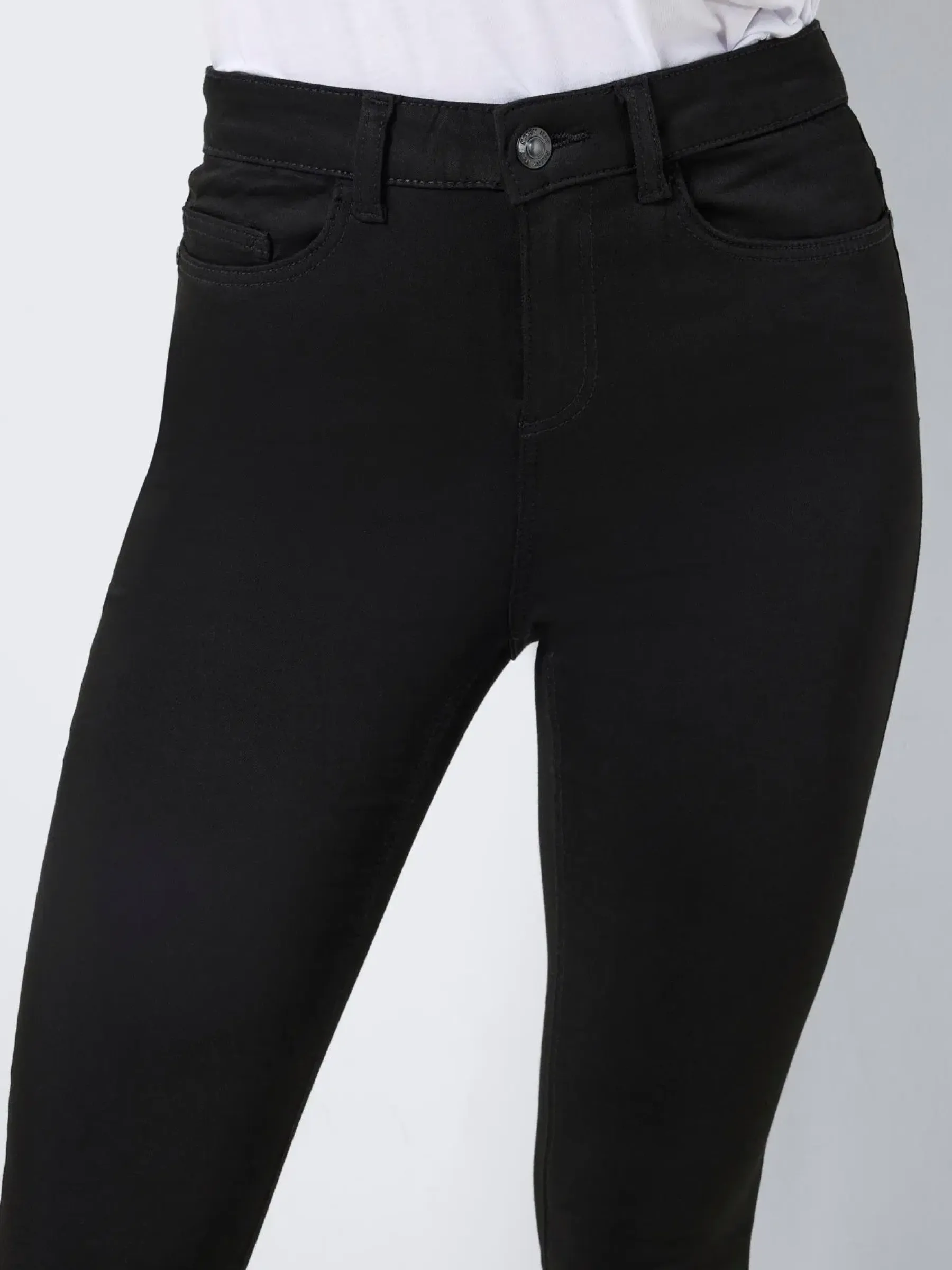 Korkeavyötäröisissä Skinny-fit farkuissa on vyölenkit vyötäröllä, vetoketju- ja nappikiinnitys. Farkut pysyvät tyköistuvina ja mustina käyttökerrasta toiseen.