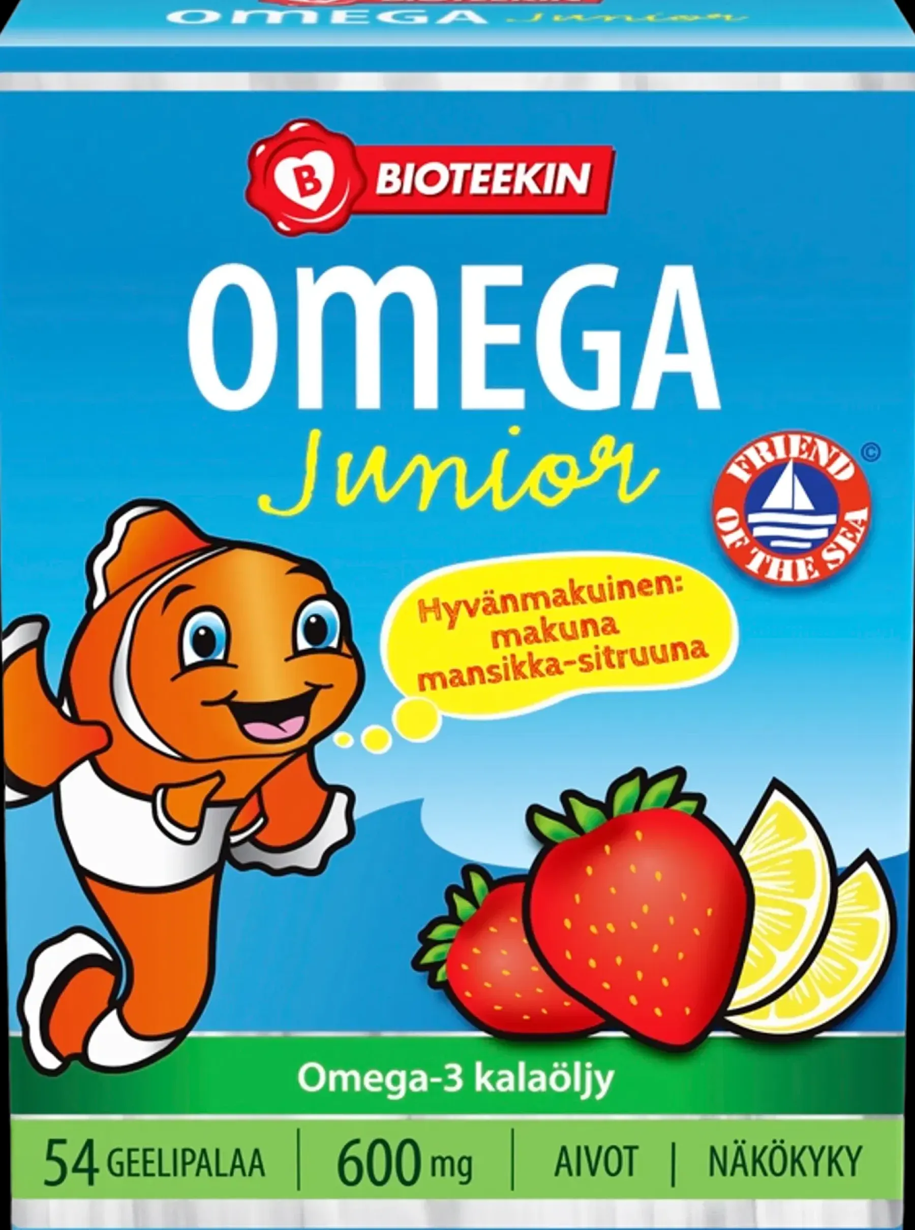 Bioteekki Omega Family on mansikka-sitruunan makuinen ravintolisä, joka sisältää runsaasti kalaöljyä, etenkin aivoille tärkeää DHA-rasvahappoa. Tuote on Friend of the Sea -sertifioitu eli se on valmistettu kestävän kehityksen periaattein tuotetusta kalaöljystä. Gluteeniton, laktoositon, maidoton.