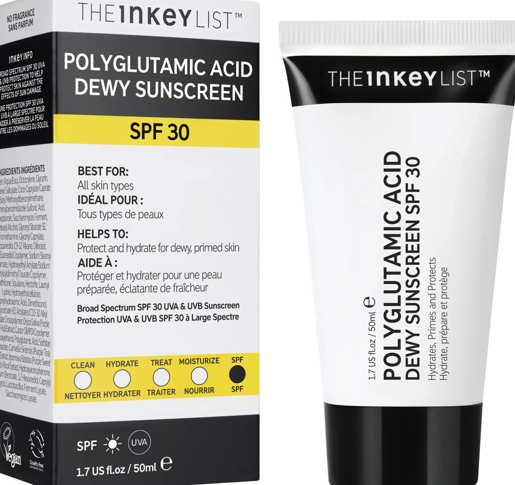 Aqua (Water), Octocrylene, Glycerin, Ethylhexyl Salicylate, Coco-Caprylate/Caprate, Butyl Methoxydibenzoylmethane, Phenylbenzimidazole Sulfonic Acid, Triheptanoin, Saccharomyces Ferment, Cetearyl Alcohol, Glyceryl Stearate SE, Tromethamine, Glyceryl Caprylate, Propanediol, C9-12 Alkane, Dilinoleic Acid/Butanediol Copolymer, Sodium Stearoyl Glutamate, Hydroxyethyl Acrylate/Sodium Acryloyldimethyl Taurate Copolymer, Dimethicone, Squalane, Hectorite, Lauroyl Lysine, Hydroxyethylcellulose, Caprylhydroxamic Acid, Dimethiconol, Polysorbate 60, Acrylates/C10-30 Alkyl Acrylate Crosspolymer, Oryza Sativa (Purple Rice) Hull Extract, Castor oil /IPDI copolymer, Phenoxyethanol, Polyglutamic Acid, Sorbitan Isostearate, Camellia Sinensis (Purple Tea) Leaf Extract, Ipomoea Batatas (Purple Sweet Potato) Root Extract, Hydroxyacetophenone, Sodium Benzoate, 1,2-Hexanediol, Caprylyl Glycol, Lactobacillus Ferment Lysate, Saccharomyces Lysate