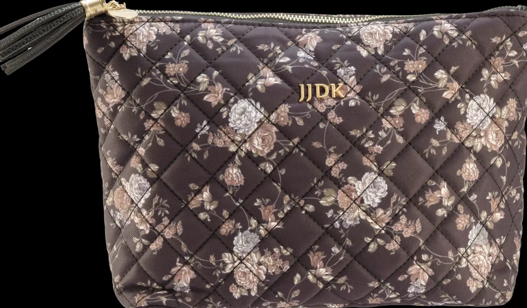 Musta kukkakuvioinen kosmetiikkalaukku neljällä sisätaskulla ja hapsuvetoketjulla. Materiaali: Polyesteri. Koko: 25x19x9cm.