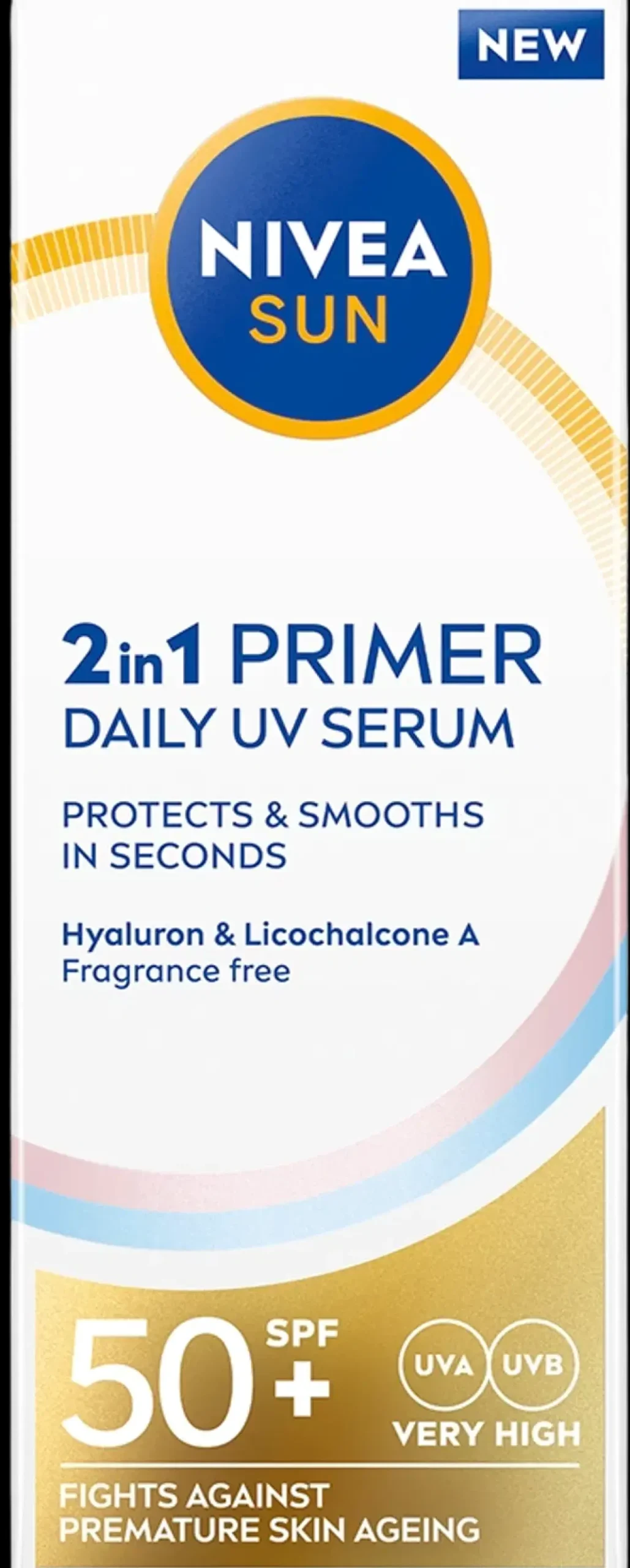 NIVEA SUN 2in1 Primer Daily UV Serum SK 50+ – kevyt aurinkosuojaseerumi yhdistää aurinkosuojan hyaluronihapon ja Licochalcone A:n kanssa, tehden ihosta terveen näköisen ja huomattavan pehmeän. Kehitetty erityisesti suojaamaan ja silottamaan kasvojen ihoa välittömästi. Innovatiivinen aurinkosuojaseerumi suojaa ihoa UVA/UVB-säteiltä ja sinivalon (HEV) vaikutuksilta, kuten ihon ennenaikaiselta vanhenemiselta. Koostumus sisältää kahta erityypistä hyaluronihappoa sekä Licochalcone A:ta, joka on voimakas antioksidantti. Pitkäketjuinen hyaluronihappo kosteuttaa ihon ylempiä kerroksia, kun taas lyhytketjuinen hyaluronihappo imeytyy syvemmälle ihoon ja stimuloi sen luonnollista hyaluronihapontuotantoa (in vitro). Lisäksi Licochalcone A aktivoi ihon omaa puolustusmekanismia ja suojaa ihosoluja oksidatiiviselta stressiltä. Kevyt, nopeasti imeytyvä seerumi ei jätä iholle tahmaista tunnetta tai valkoisia jäämiä. Tekee ihosta tasaisen ja huomattavan sileän, sopii erinomaisesti meikin alle. Ihanteellinen jokapäiväiseen käyttöön.