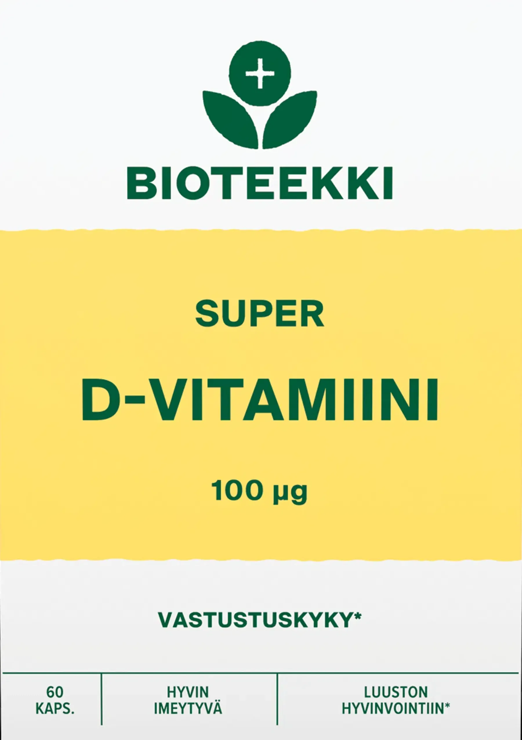 Bioteekki Super D-vitamiini on erinomaisesti imeytyvä, vahva D-vitamiini öljykapselissa. Yksi kapseli sisältää 100 mikrogrammaa D3-vitamiinia pellavansiemenöljyssä. Kapselin sisältämä öljy edistää rasvaliukoisen D-vitamiinin imeytymistä, mistä johtuen D-vitamiinin imeytyminen on tehokasta. Pieni kapseli on helppo nielaista.