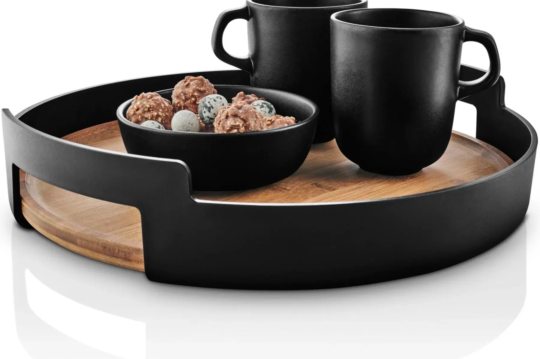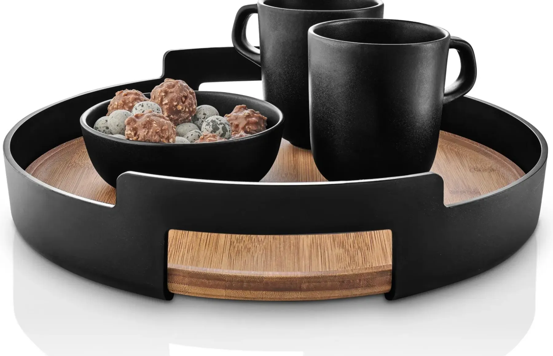 Eva Solon upeassa tarjottimessa toistuu muistakin Nordic Kitchen -sarjan tuotteista tuttu mattamustan ja lämminsävyisen puun yhdistelmä. Tarjottimen reunat on valmistettu tyylikkäästä mattapintaisesta muovista, minkä ansiosta tarjotin on kevyt kantaa. Käytännöllisyyttä lisää reunojen riittävä korkeus ja kaksi tukevaa kantokahvaa. Kanna aamiainen sänkyyn sunnuntaiaamuna, juomat terassille kesäisenä iltapäivänä tai käytä vaikka hedelmäkorina. Tarjotin on helppo puhdistaa kostealla liinalla pyyhkimällä. Bambusta valmistettu pohja pysyy kauniina, kun se öljytään säännöllisesti.