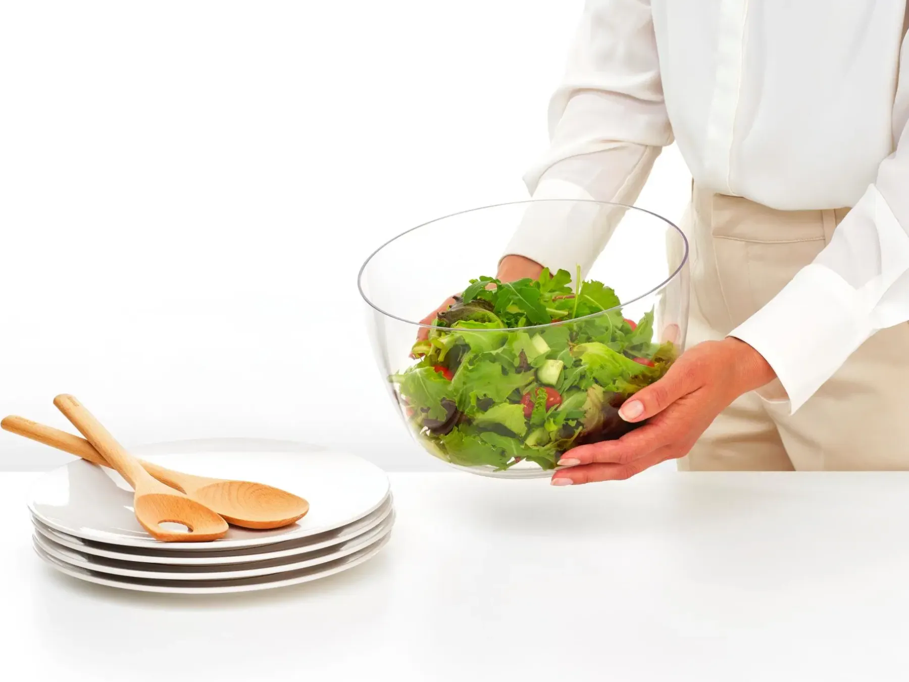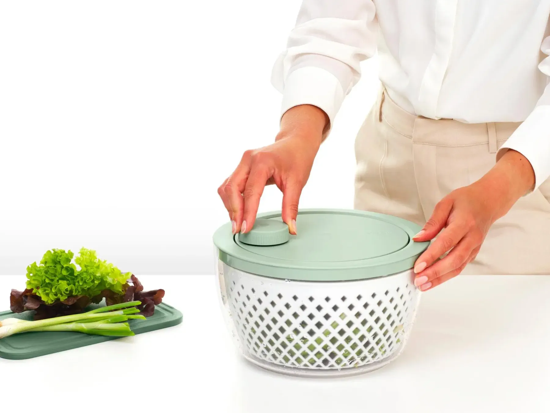 Tutustu Brabantian Tasty+ salaattilinkoon: Keittiötyöväline, jossa on jotain uutta! Tämä monikäyttöinen ihme ei vain kuivaa vihanneksesi vaan toimii myös siivilänä huuhtelua varten sekä loistaa tarjoilukulhona. Sano hyvästit märille salaateille, kun pyöräytät vaivattomasti täydellisen rapean salaatin. Tai kuivaa mustikat ja kirsikkatomaatit käden käänteessä. Uskomaton linko!