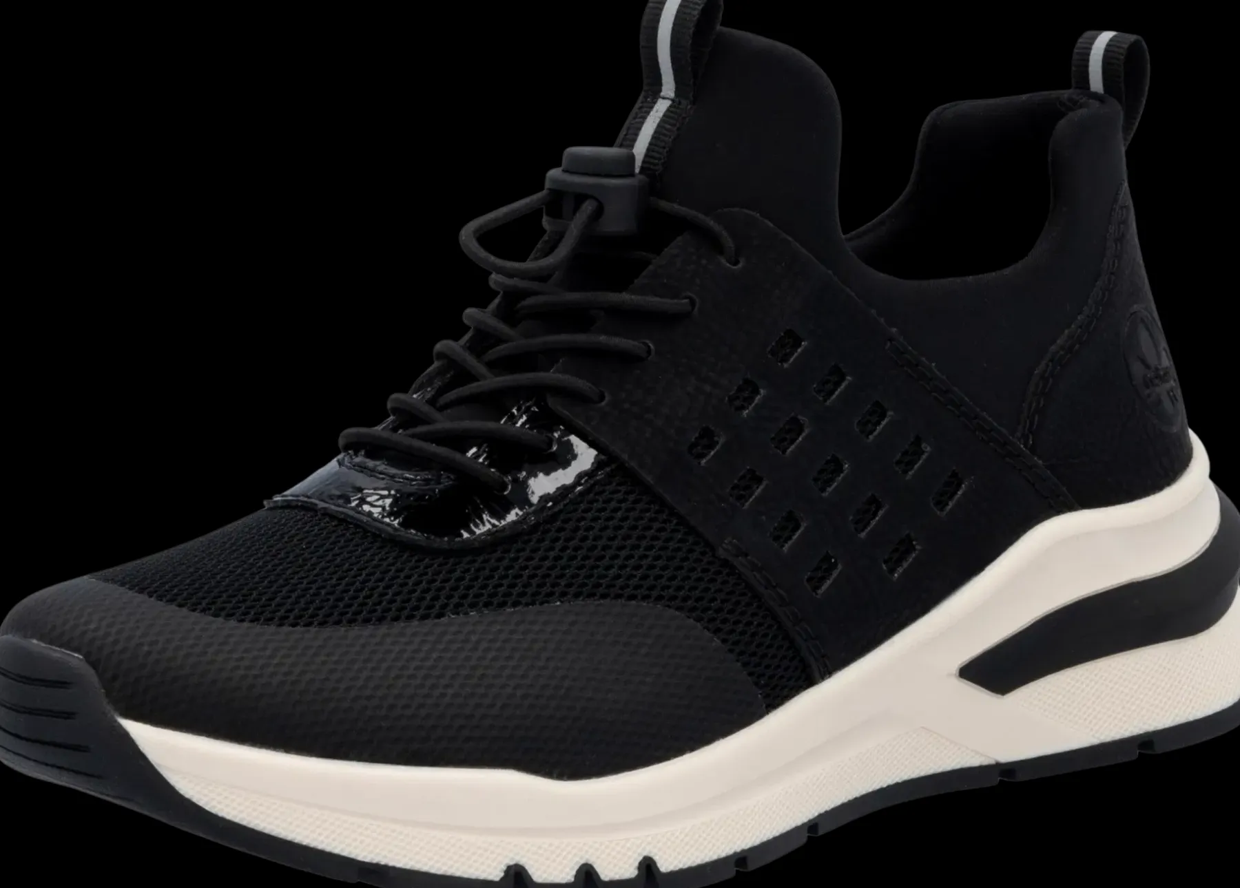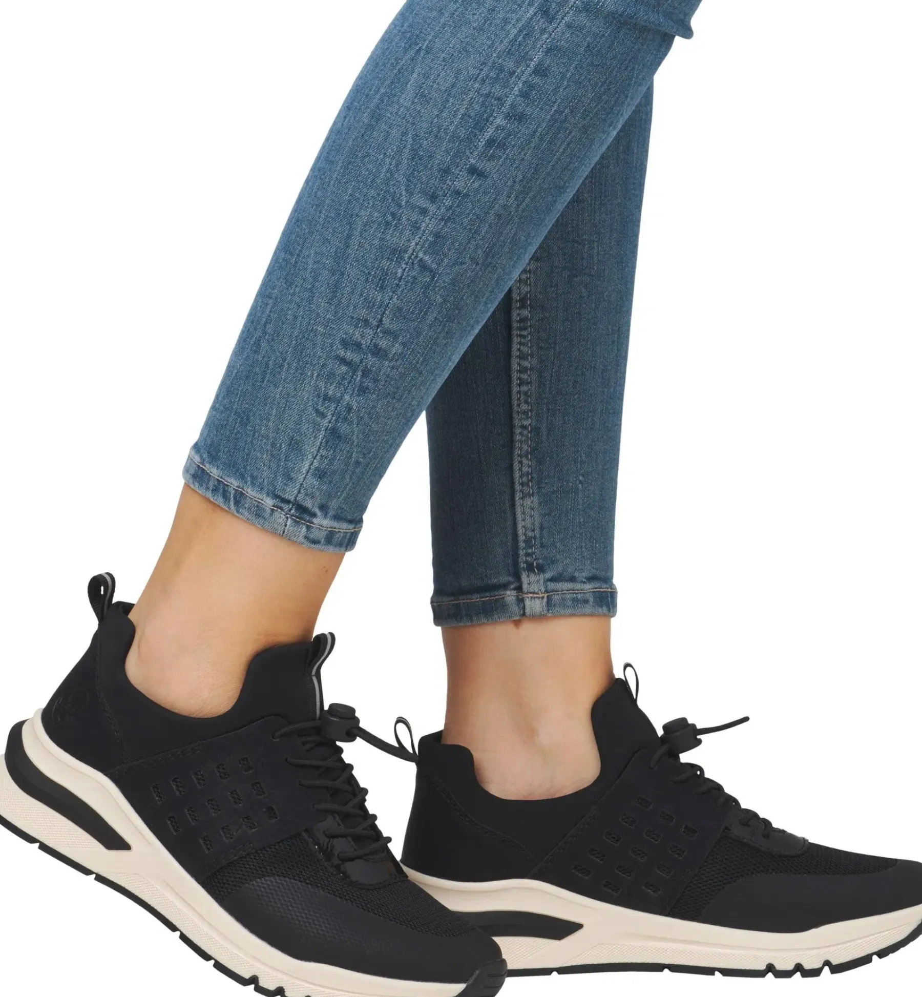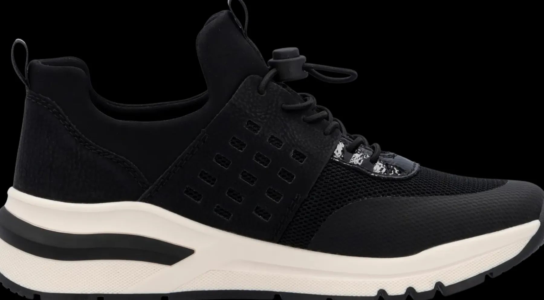 Naisten kävelykengät joissa joustonauhat, kiilapohjat ja irrotettavat pehmeät pohjalliset, synteettistä materiaalia ja tekstiiliä. Leveä lesti.
