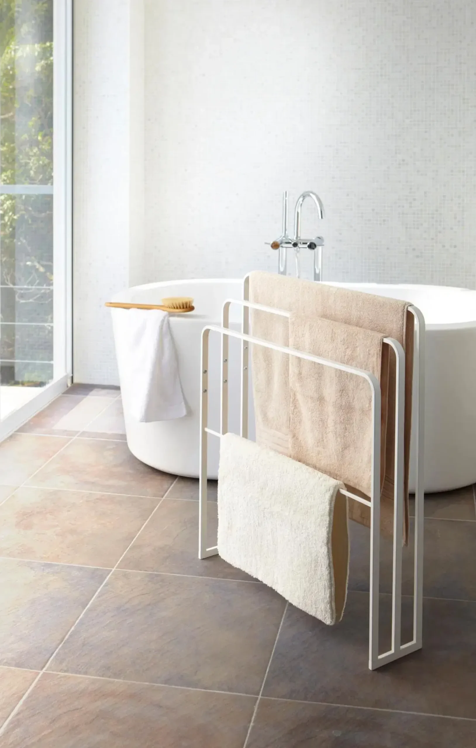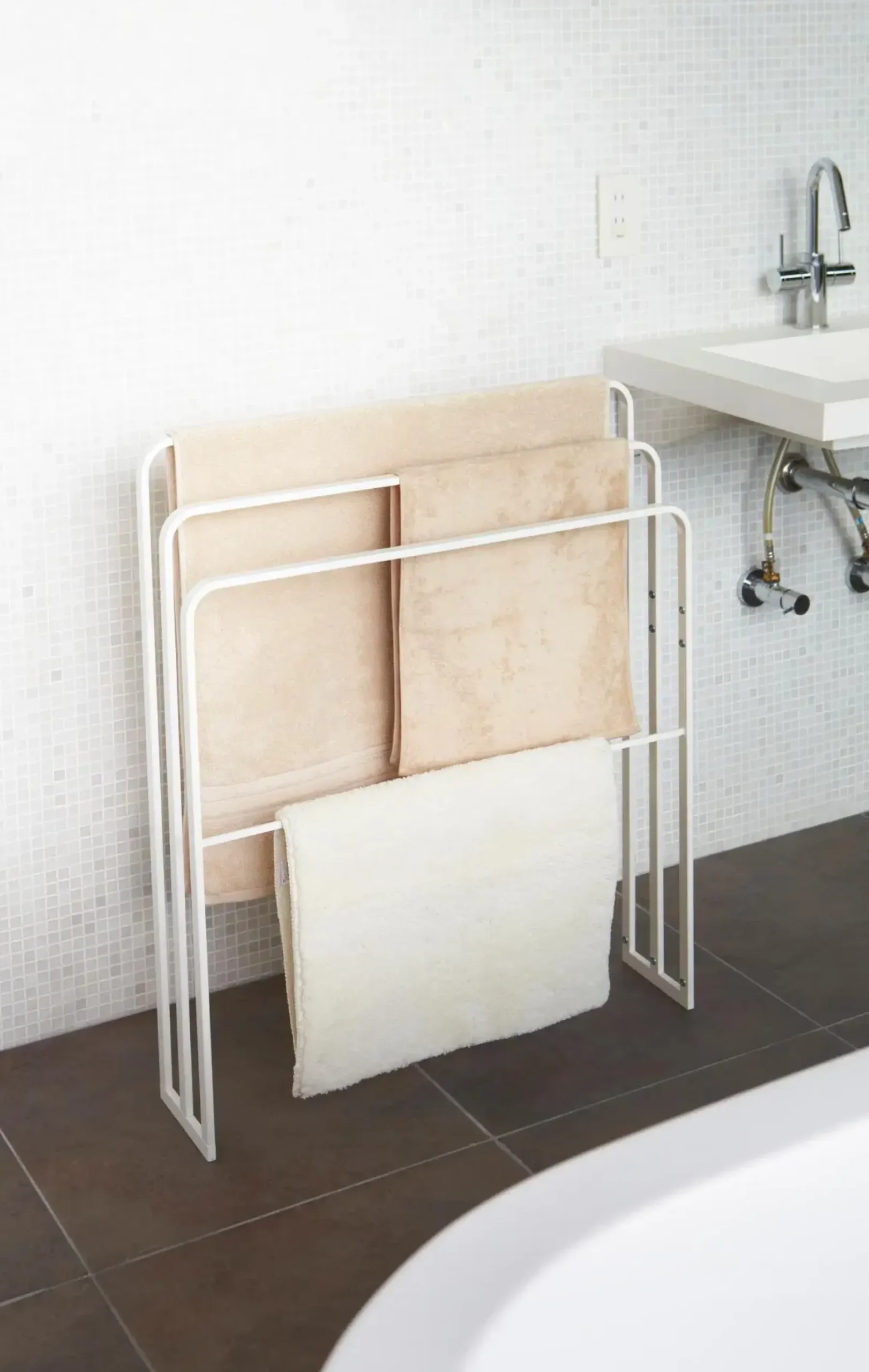 Tower-kylpypyyheteline tuo kotiin ripauksen kylpylätunnelmaa ja on tyylikäs vaihtoehto perinteiselle pyyhenaulakolle. Pyyhkeet saa asetettua kuivumaan koko leveydeltään, jolloin ne pääsevät kuivumaan ilmavasti ja pysyvät pidempään raikkaina. Teline sopii erinomaisesti myös kylpyhuonematon kuivattamiseen suihkun jälkeen. Suunniteltu Japanissa. Tuote on koottava. Mitat: 70 x 14 x 81 cm