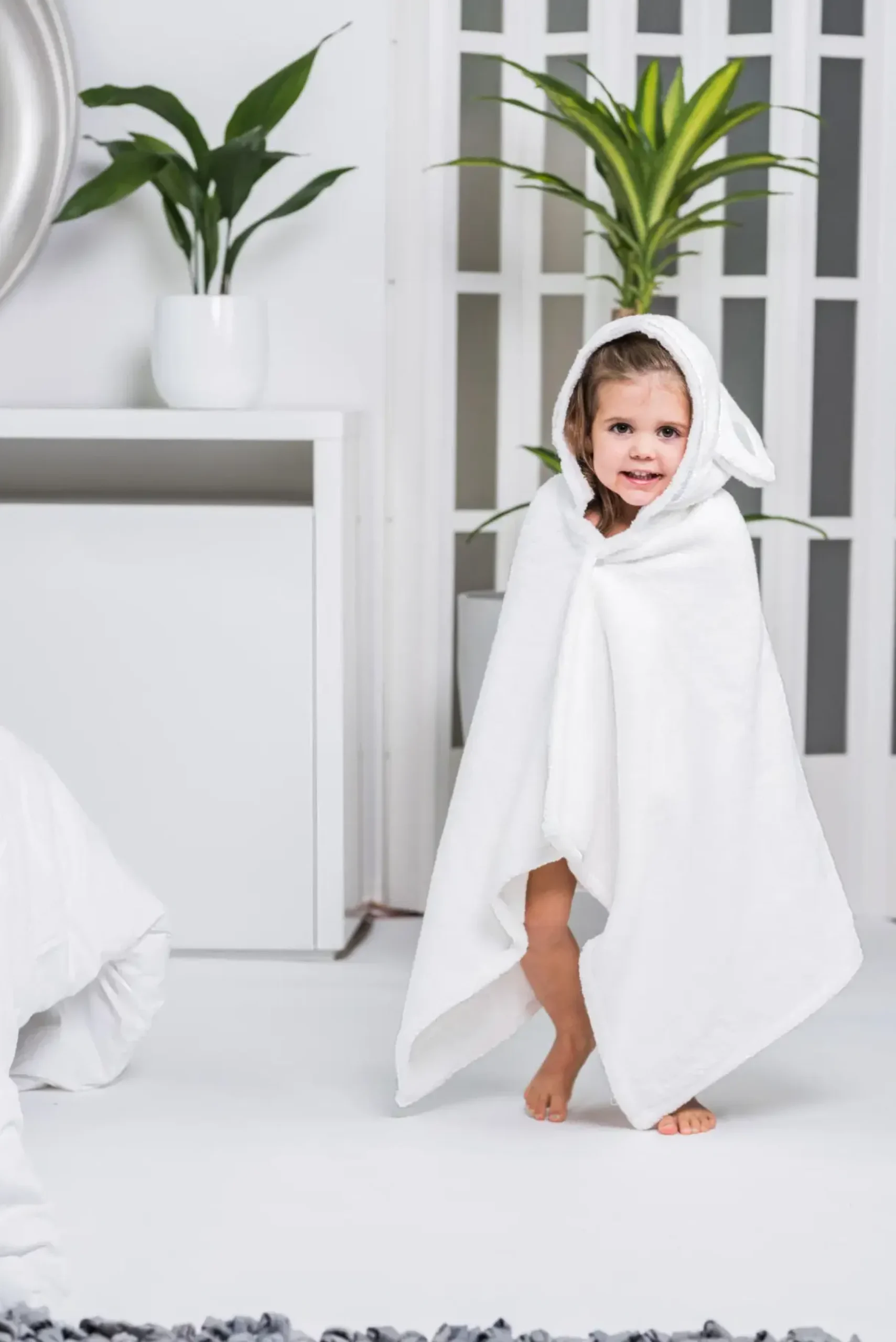 Pyyhe, joka toimii sekä vauvapyyhkeenä että jo kävelevän lapsen viittapyyhkeenä nepparikiinnityksen avulla; Sopii n. 0-5-vuotiaille; Reilu koko 60×120; Tilava huppu, jossa söpöt korvat; Ylellinen Luin Livingin 100% puuvillainen Signaturepyyhekangas