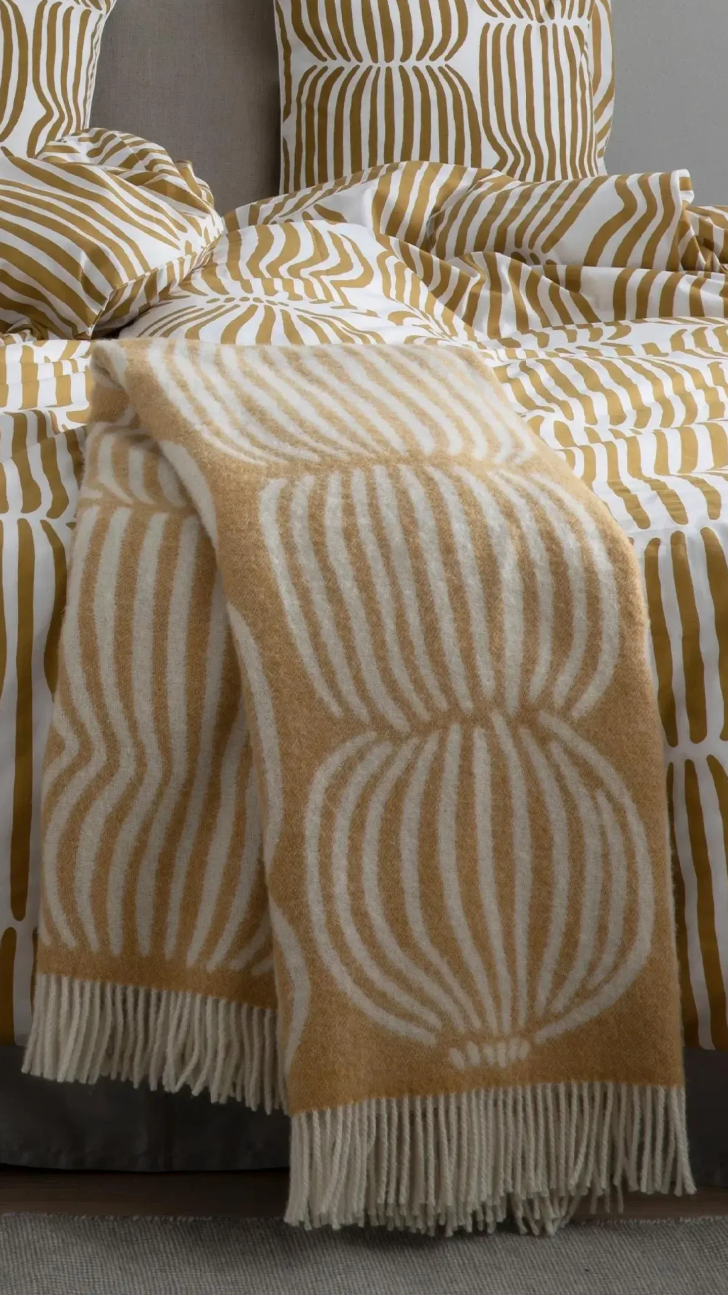 Minna Niskakankaan suunnittelema lämminhenkinen Vilja-kuosi on saanut inspiraationsa alkusyksyn tuulessa huojuvista kypsistä viljapelloista. Vilja-malliston moderni muotokieli sopii täydellisesti suomalaiseen ja skandinaaviseen kotiin. Vaaleanruskeaan Vilja-torkkupeitto lämmittää ihanasti ja tuo kaunista ilmettä kotiin. Villaisen torkkupeiton koko on 130×170 cm.