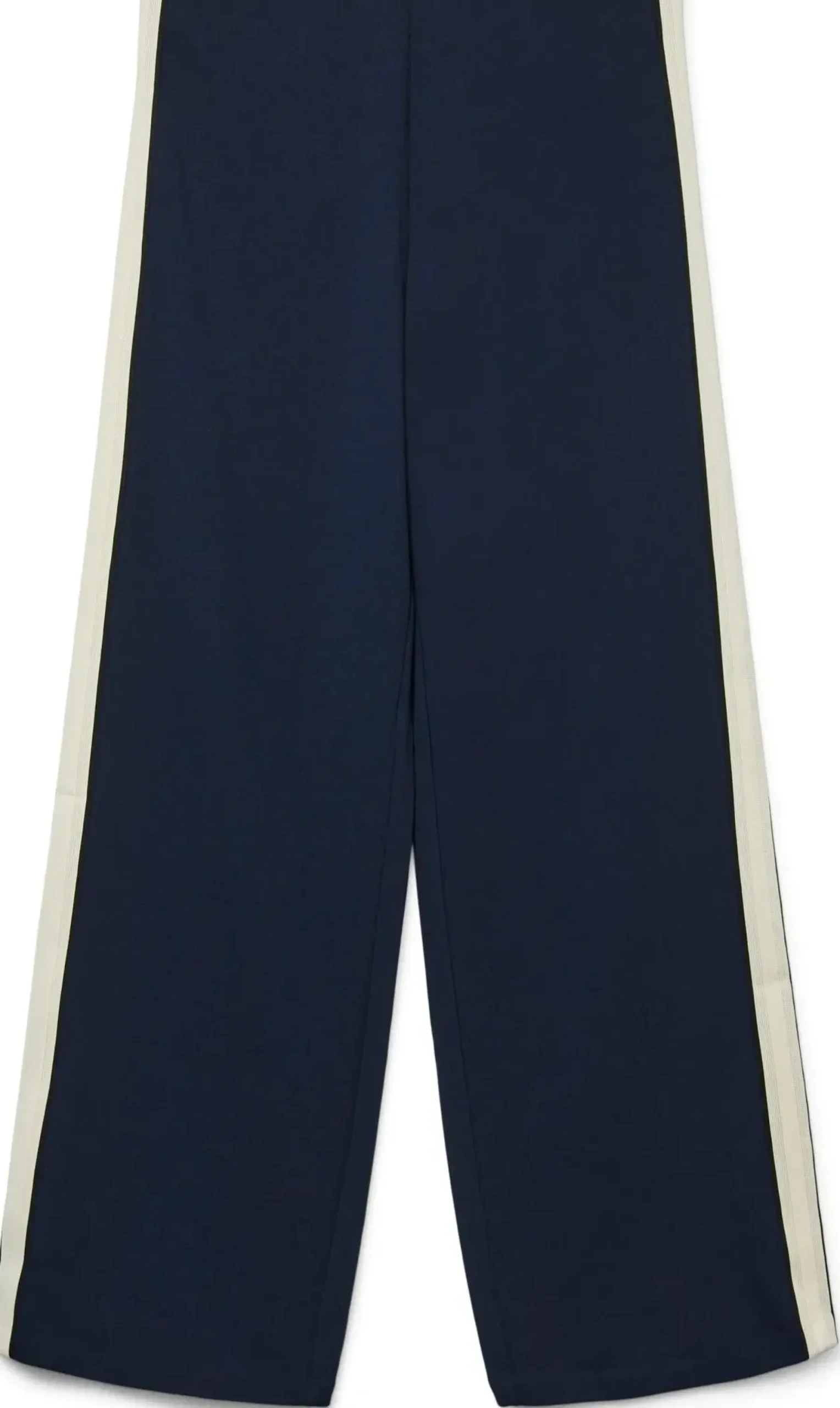 Muodikkaat, leveälahkeiset housut sivuraidalla. Joustava, normaalikorkuinen vyötärö.