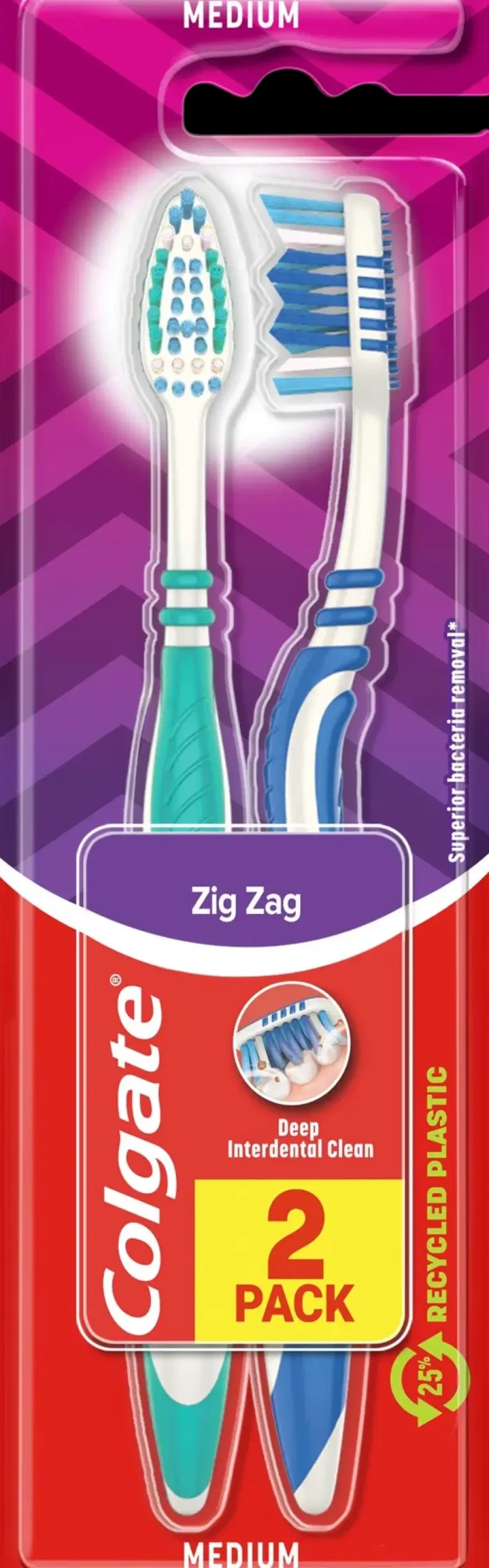 Puhdista suusi tehokkaasti Colgate ZigZag Medium -hammasharjalla, jonka ristikkäiset harjakset puhdistavat syvältä hammasväleistä ja kielenpuhdistin poistaa pahaa hajua aiheuttavia bakteereja koko suusta. Colgate ZigZag -hammasharjan joustava kaula tekee harjaamisesta mukavampaa sekä hellävaraisempaa ikenille. Harjaksiin uutetut hopeaionit estävät bakteerien kasvua harjaksissa*.