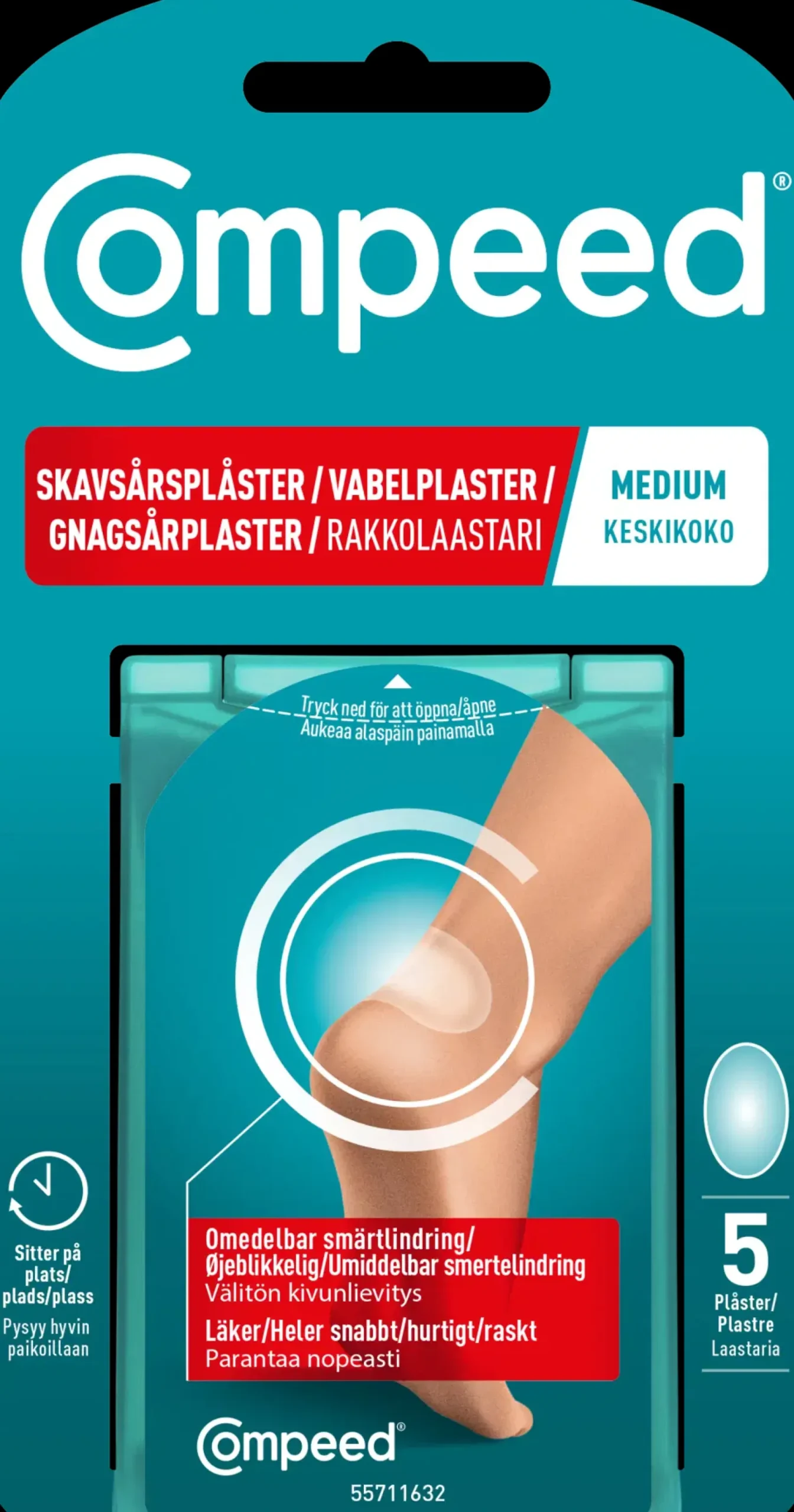 Compeed® Medium -Rakkolaastari imee ylimääräisen kosteuden ja muodostaa suojaavan pehmusteen sekä lievittää välittömästi kipua ja luo optimaaliset olosuhteet jalkarakkojen paranemiselle. Saatavilla useassa eri pakkauskoossa.