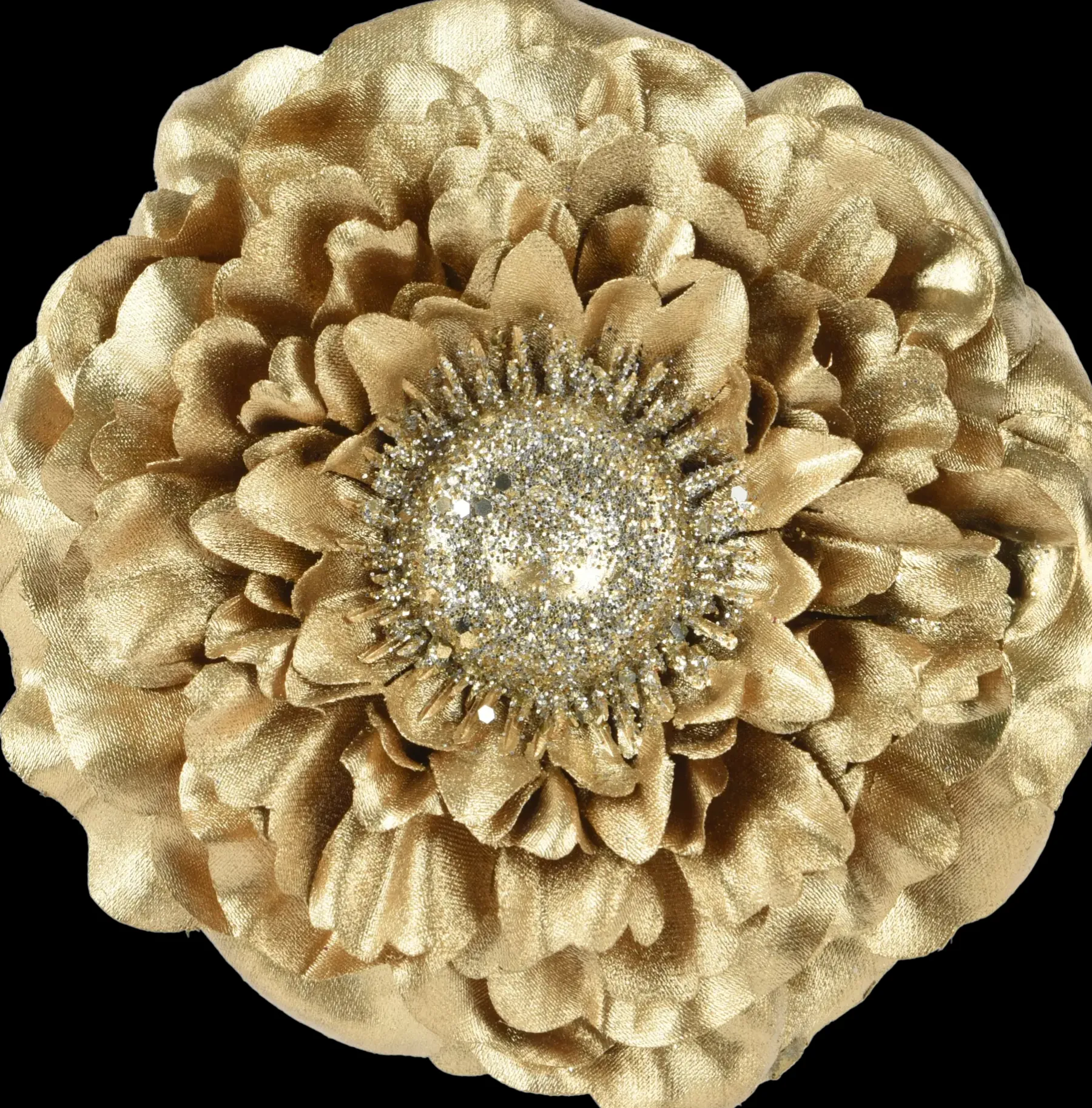 Kullanvärinen glitterinen koristekukka, kiinnitys klipsillä.