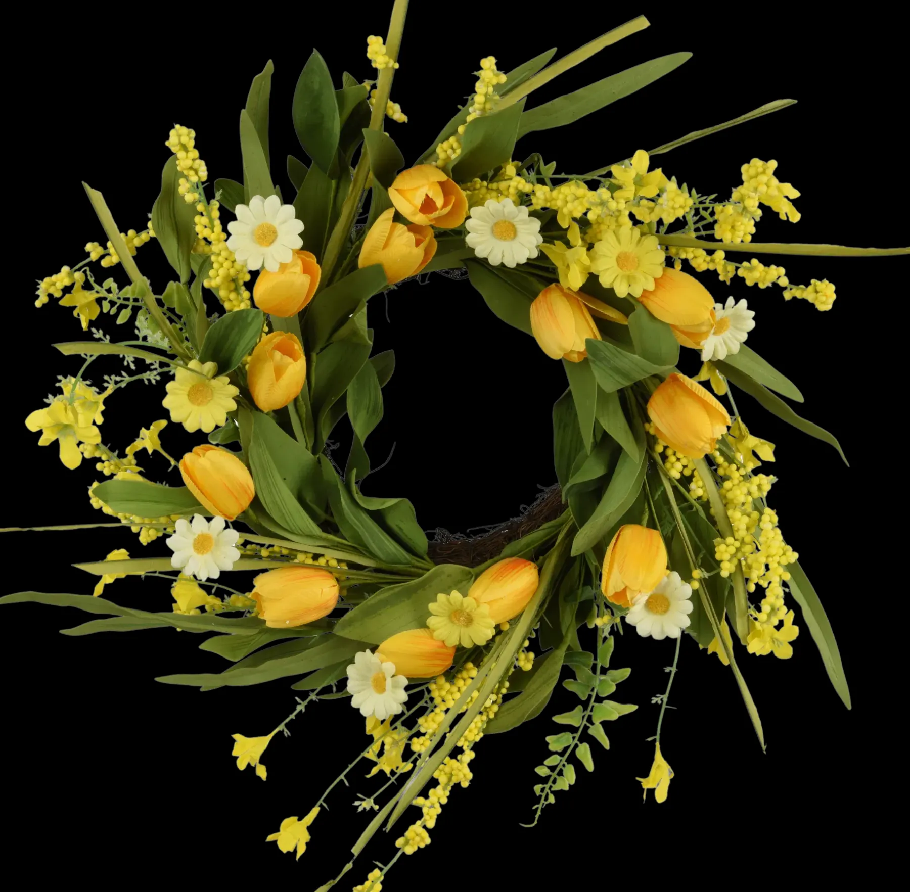 Keltaiset tulppaanit ja päivänkakkarat koristavat tätä kranssia, jonka halkaisija on 55 cm. Sisäkäyttöön
