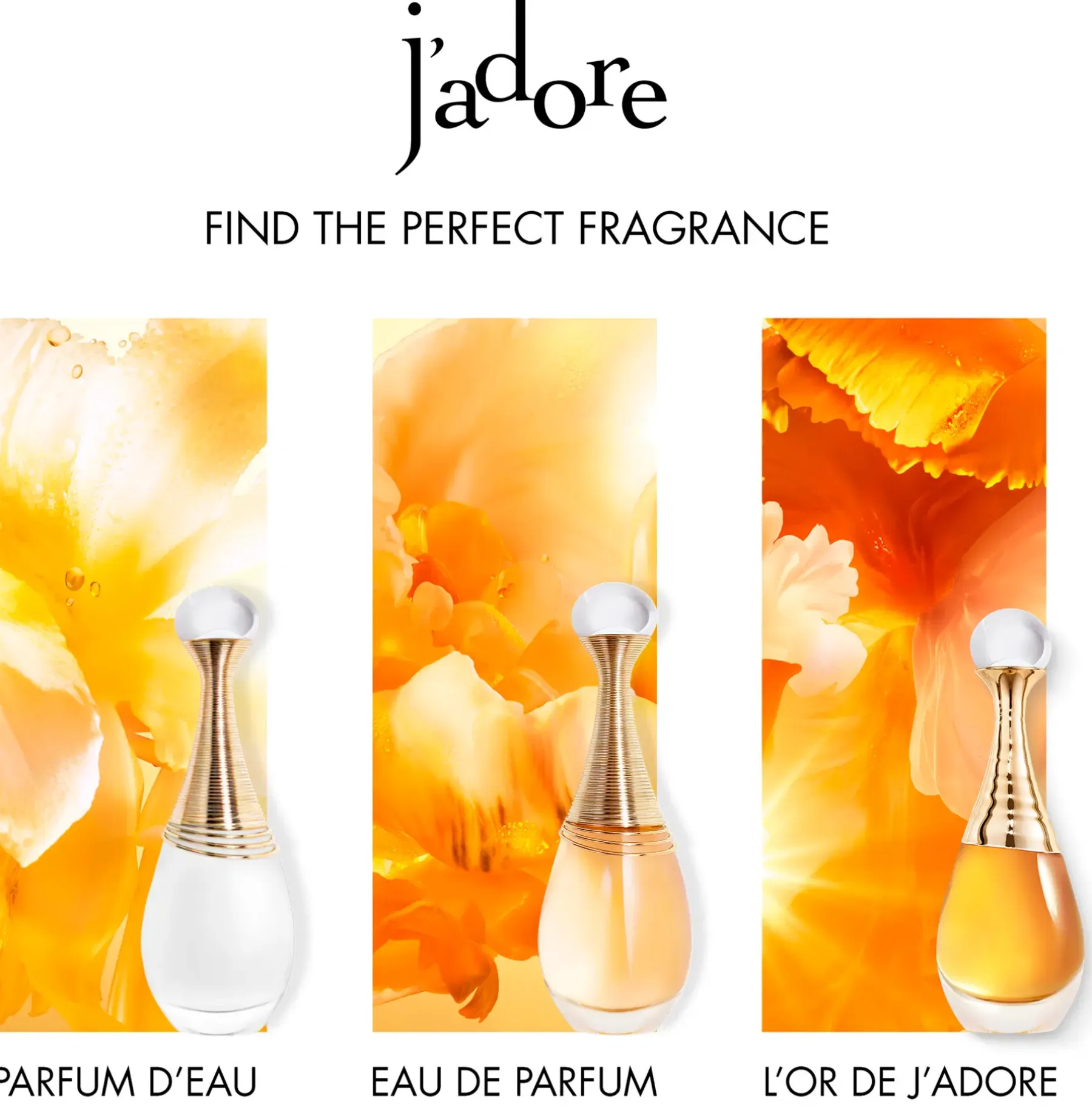 Appelsiininkukan, jasmiini grandiflorumin ja centifolia-ruusu-absoluuttien tuoksut kukkivat täyteläisinä ja aistillisina: ne ovat J’adoren todellinen kulta.