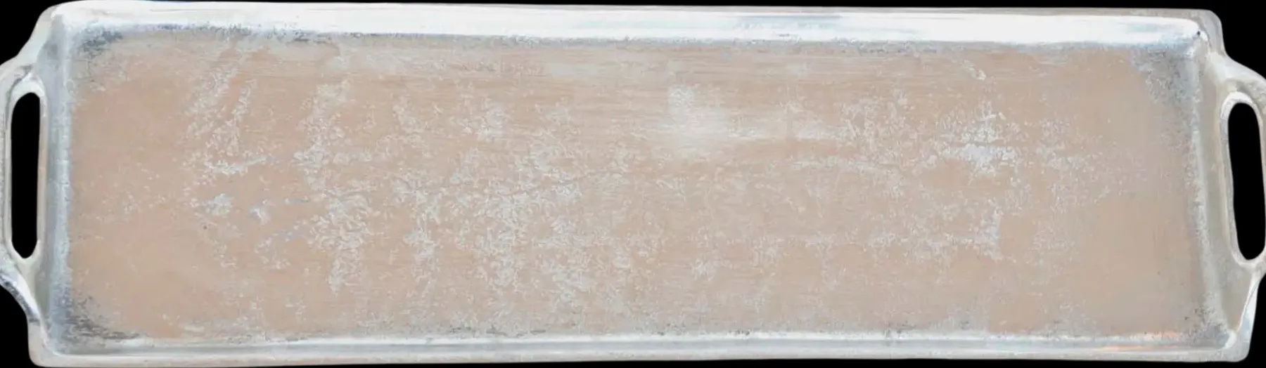 Alumiinista valmistettu kapea tarjotin kahvoilla. Sopii esimerkiksi kynttiläalustaksi.