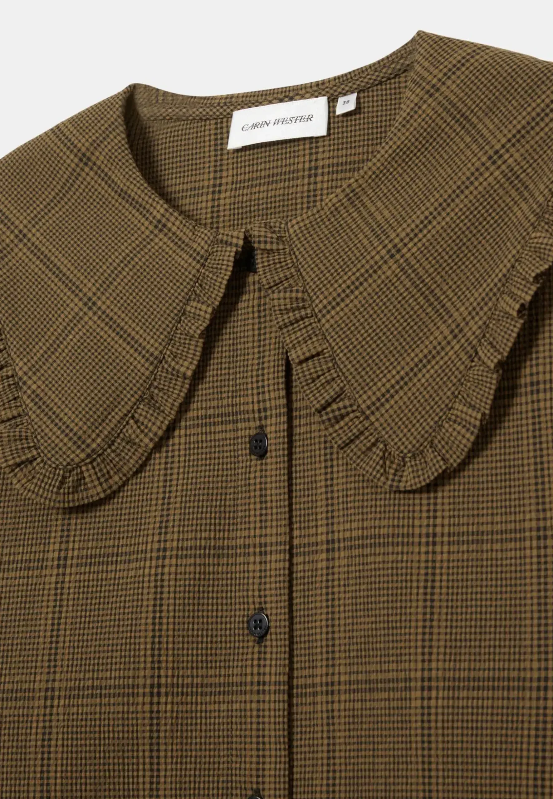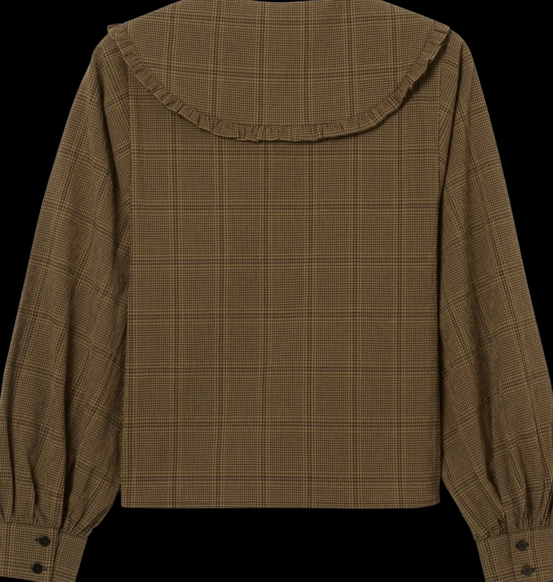 ANELLA on ilmava pitkähihainen paita, jossa on näyttävä röyhelökaulus ja leveät hihansuut. Paita on valmistettu puuvillasekoitteesta, jossa on kevyesti strukturoidun kreppimäisen materiaalin elävä pinta. Suora ja väljä malli sekä etupuolen nappikiinnitys tekevät paidasta rennon mutta huolitellun valinnan arkeen ja juhlaan.