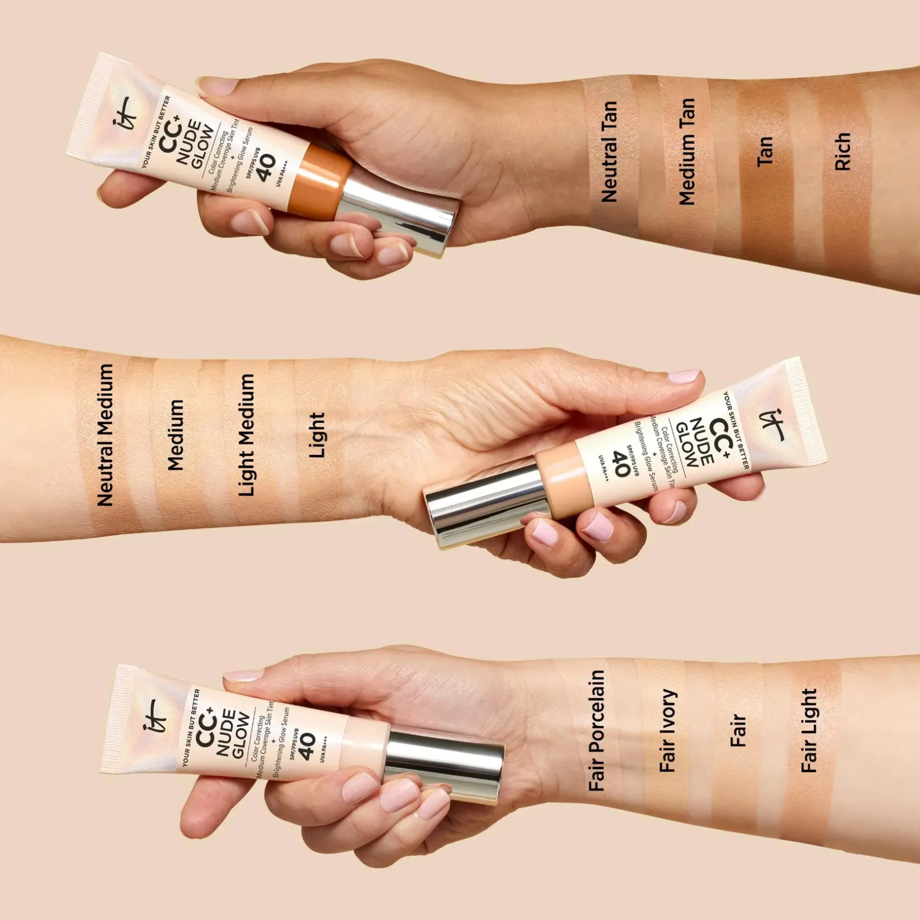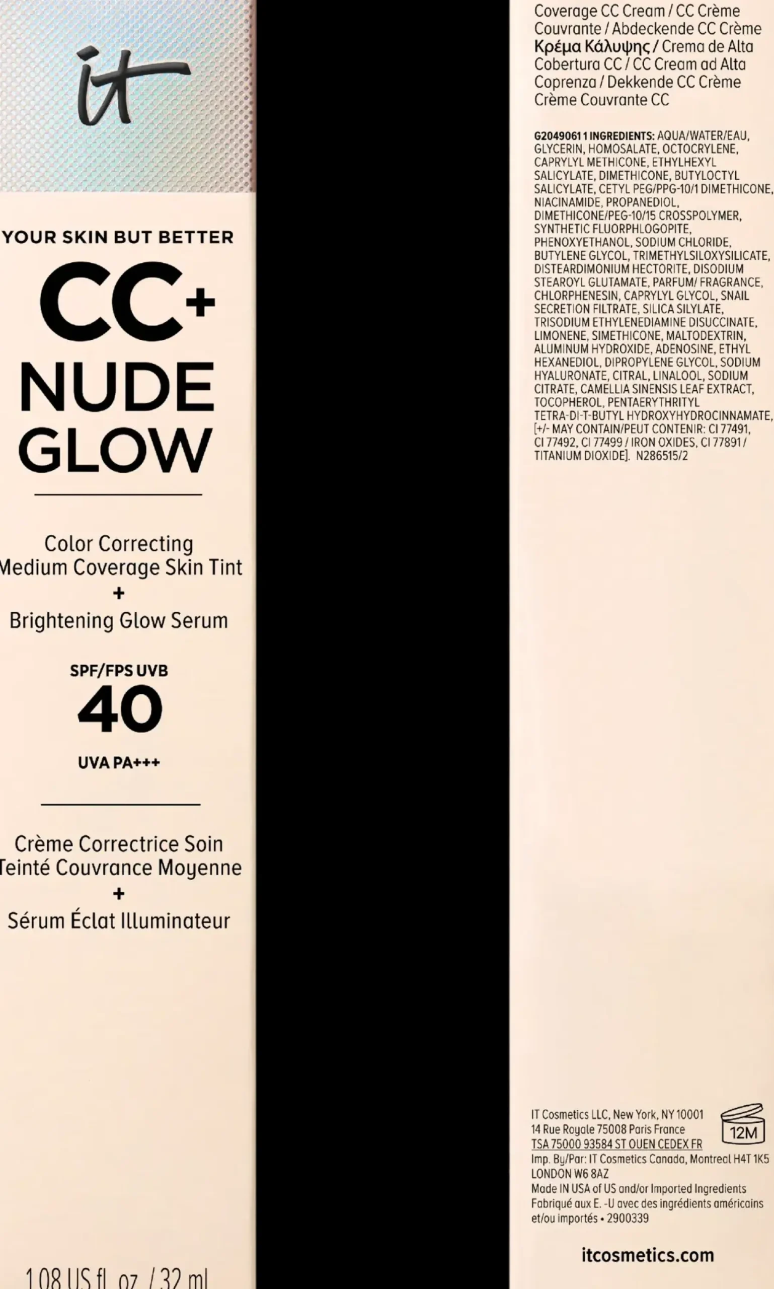 Kirkas ja kosteutettu iho saa uutta hehkua välittömästi IT Cosmetics CC+ Nude Glow SPF 40 -meikkivoiteesta. Se on kevyt puolipeittävä meikkivoide, jonka avulla saat luonnollisen lopputuloksen. Siinä on ihoa hoitavia ominaisuuksia, koska se sisältää muun muassa niasiiniamidia, hyaluronihappoa ja vihreää teeuutetta. Tämä ihon sävyä tasoittava meikkivoide on kliinisesti testattu** ja se auttaa parantamaan iho-ongelmia sekä tekee ihosta kirkkaamman ja sileämmän näköisen.