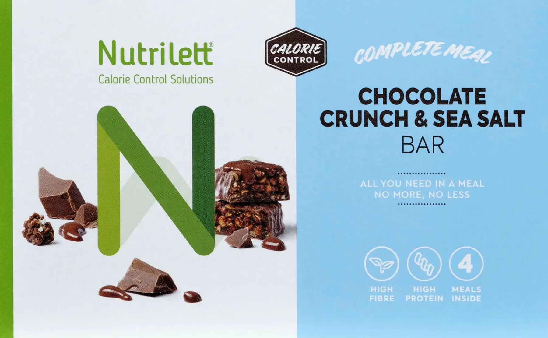 Nutrilett Chocolate Crunch & Seasalt -patukka on ateriankorvike, joka yhdistettynä tavalliseen vähäkaloriseen terveelliseen ruokaan auttaa sinua painonpudottamisessa tai -hallinnassa painonpudotuksen jälkeen. Patukka koostuu herkullisesta suklaacrunchista ja siinä on ripaus merisuolaa. Ateriankorvikkeet sisältävät runsaasti proteiinia, välttämättömät rasvahapot sekä vitamiineja ja kivennäisaineita vähintään kolmasosan päivän saantisuosituksesta. Tuote sisältää runsaasti kuitua. Nutrilett-ateriankorvikkeella voidaan korvata yksi tai kaksi päivän pääaterioista. Kahden pääaterian korvaaminen päivässä ateriankorvikkeella vähäenergiaisen ruokavalion yhteydessä auttaa painonpudotuksessa ja yhden pääaterian korvaaminen auttaa ylläpitämään painoa painonpudotuksen jälkeen. Tuotteessa käytetty kaakao on Rainforest Alliance -sertifioitu. Monipakkaus sisältää neljä patukkaa.
