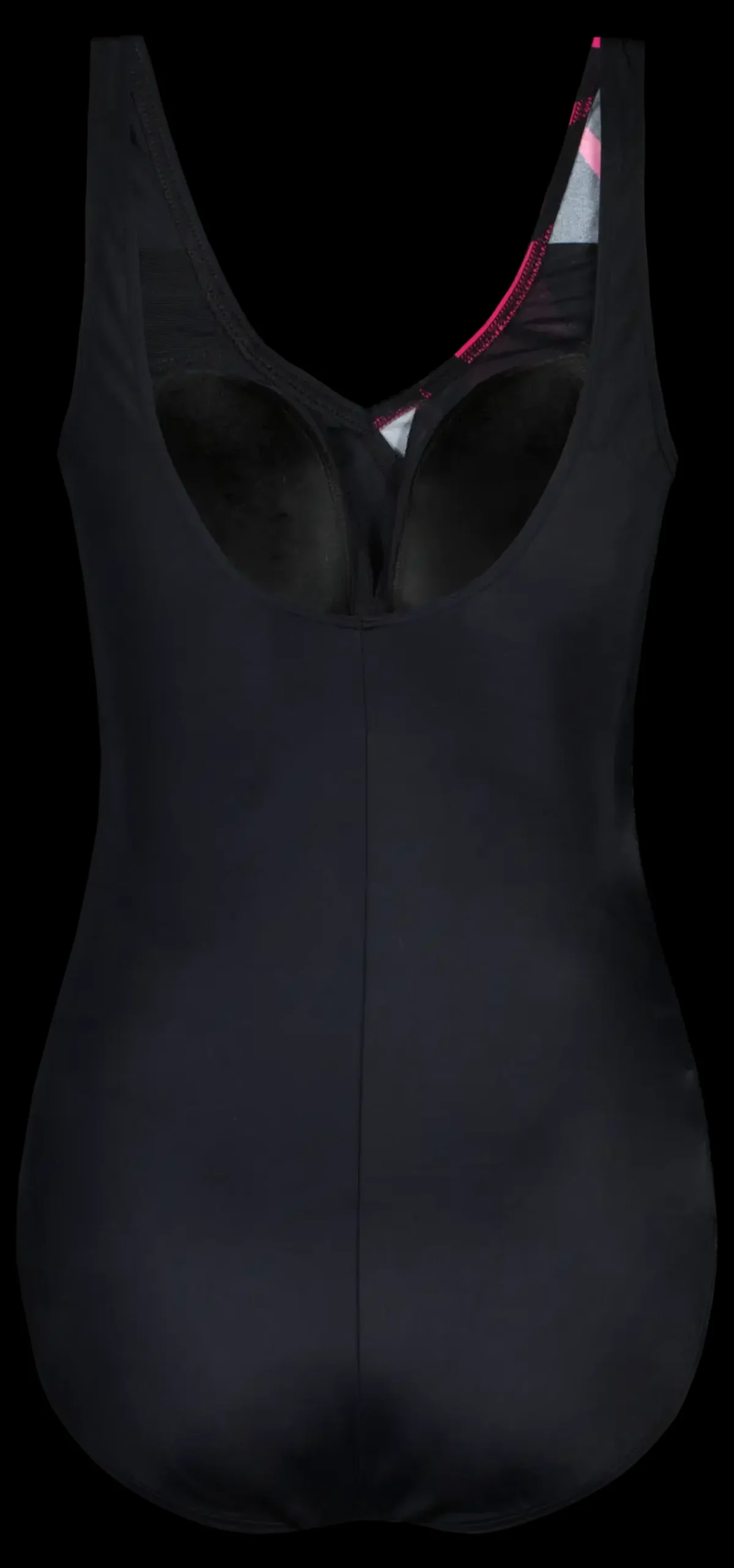 Damella naisten kuviollinen uimapuku, jossa on pehmustetut rintaliivit sisäpuolella tukemassa rintoja. Uimapuvussa on laskostettu kiertovaikutelma etuosassa kontrastivärillä, mikä luo tyylikkään ja hurmaavan ilmeen.