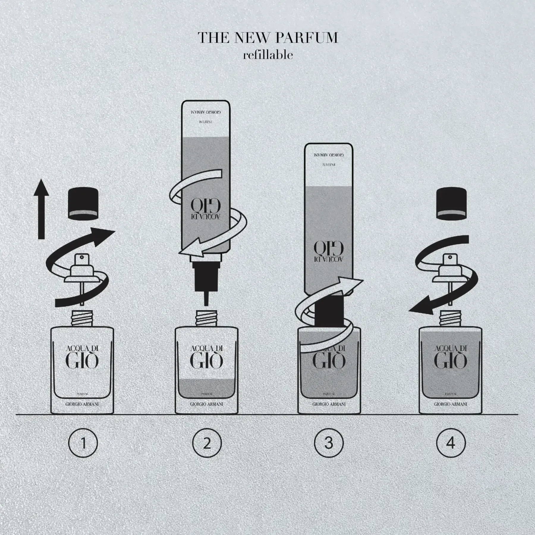 Uudelleentäytettävän pullon muotoilussa näkyy uutta arvokkuutta: ohut, maskuliininen muoto on luotu mustan sävyillä. Uudelleentäytettävä Acqua di Giò Parfum -pullo korostaa brändin sitoutumista ympäristöön. Täyttöpullo myydään erikseen.