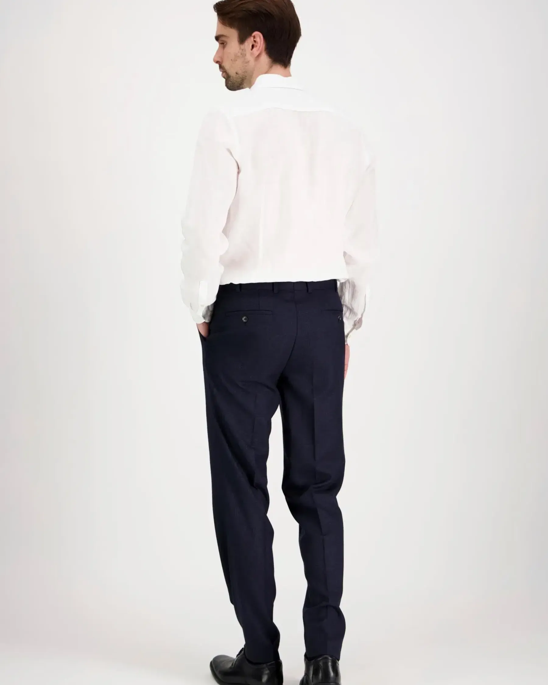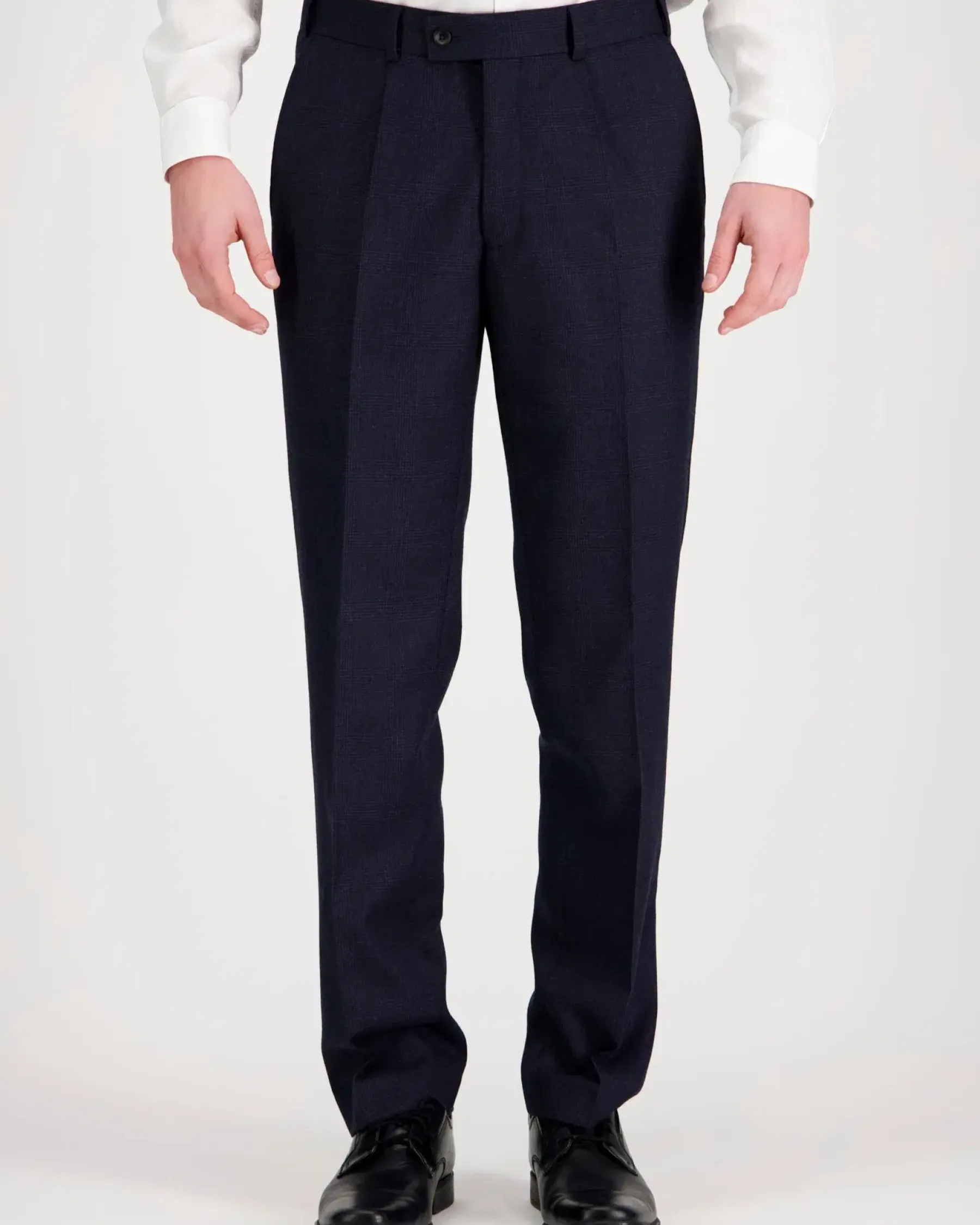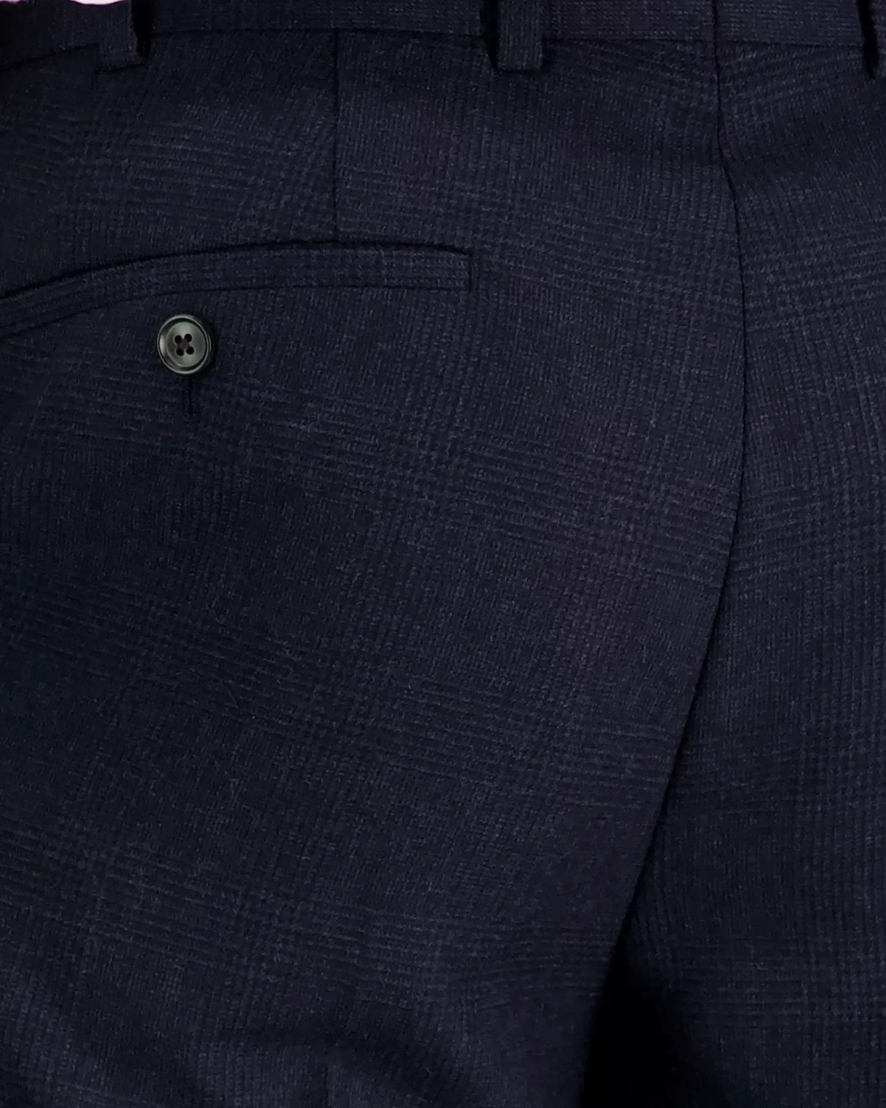 Tummansiniset Modern fit puvunhousut hienostuneen ruudullisesta villakankaasta. Housuihin on yhdistettävissä samasta kankaasta valmistettu Bilbao 6470 housut. Tämä puku täyttää kaikki virallisen pukeutumisen kriteerit, mutta tuo samalla vaihtelua ja mielenkiintoa ruudullisella kuosillaan.