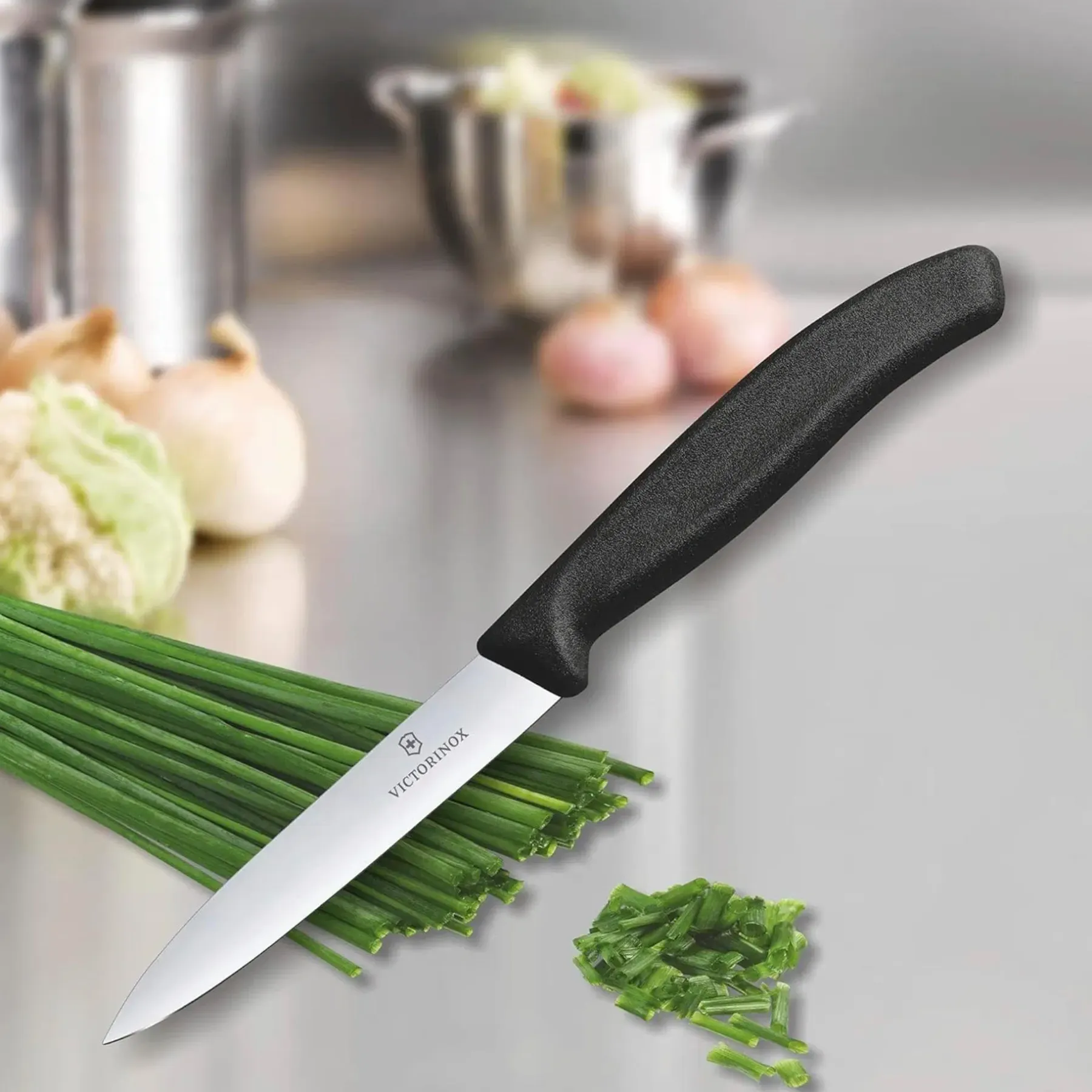 Suorateräinen kuorimaveitsi upealla Swiss Claccis-kahvalla. Terän pituus 10cm.