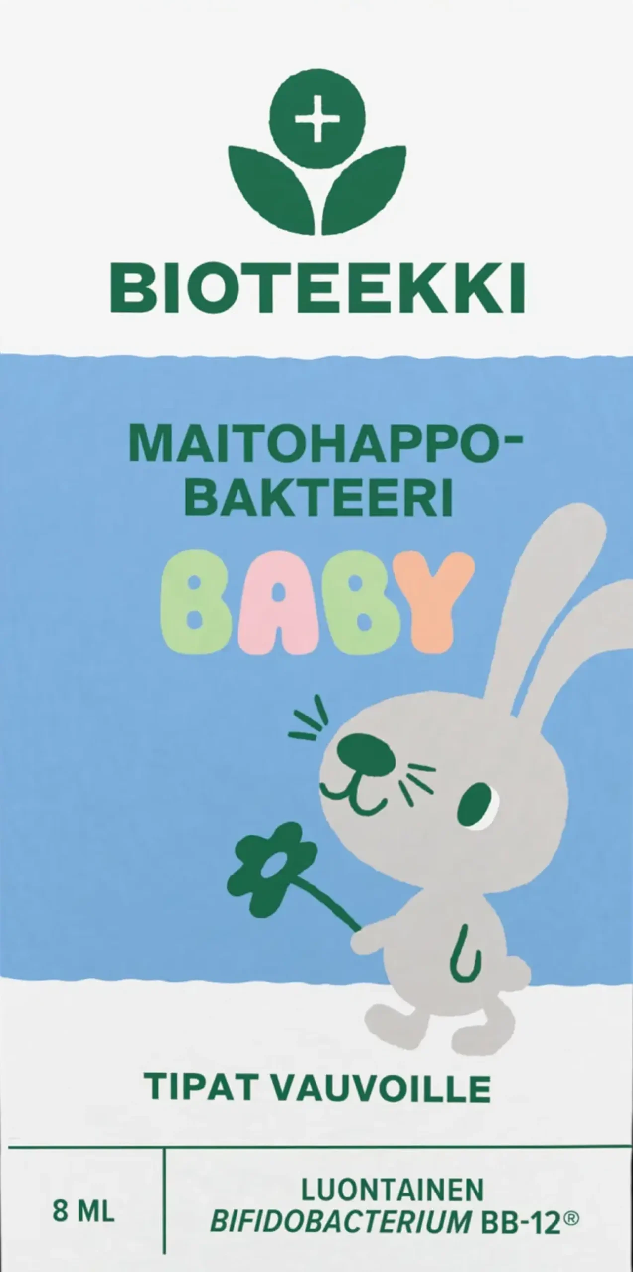 Bioteekki Maitohappobakteeri Babyn sisältämä Bifidobacterium BB-12® on vauvalle luontainen ja kliinisesti tutkittu maitohappobakteeri. Tipat sisältävät 1 miljardi elävää Bifidobacterium BB-12® -bakteeria / 6 tippaa, ja sopivat päivittäiseen käyttöön tai kuurina vastasyntyneille ja vanhemmille. Sopii myös vastasyntyneille. D-vitamiinia suositellaan käyttöön 2 viikon iästä alkaen.