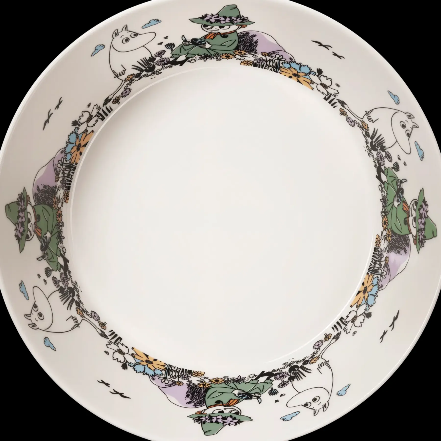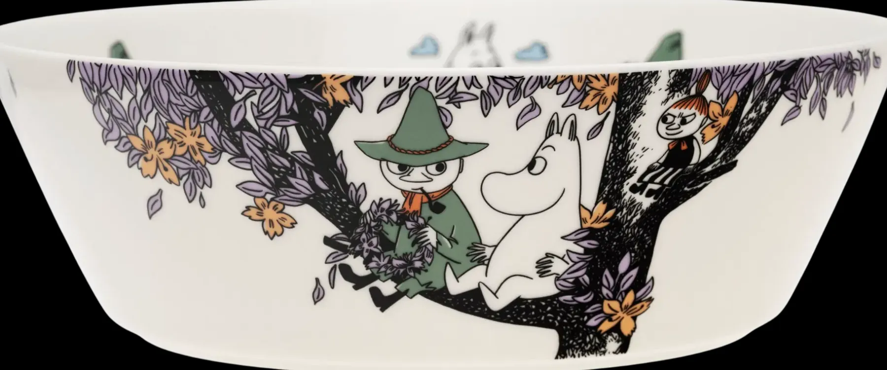 Kokoelmassa seikkailevat Nuuskamuikkunen, Muumipeikko ja Pikku Myy – utelias kolmikko aina valmiina uuteen seikkailuun. Kuvituksessa Nuuskamuikkunen palaa Muumilaaksoon, ja ystävät ovat taas yhdessä. Moomin Arabia -tarjoilukulho 23cm, Sydänystävät
