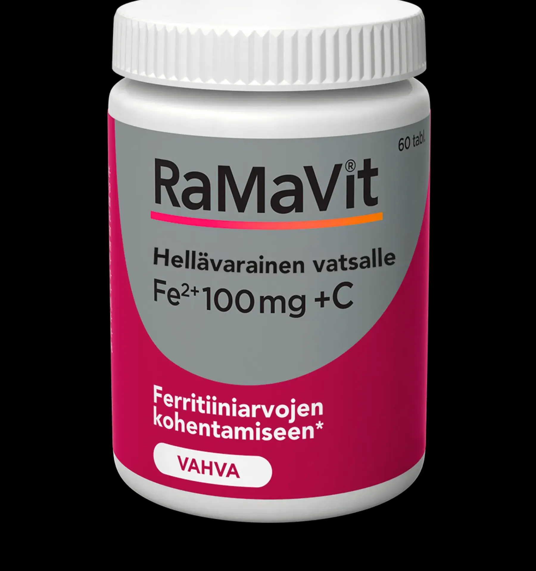 Ramavit Rauta 100 mg on vahva rautavalmiste hemoglobiini- ja ferritiiniarvojen tueksi, joka sopii myös herkkävatsaisille. Helposti nieltävä tabletti sisältää rautabisglysinaattia, joka on orgaaninen aminohappokelaatti. Tässä muodossa rauta on hyvin siedetty ja heti valmis imeytymään, eikä se heikennä muiden hivenaineiden imeytymistä. Siksi tabletin voi nauttia sekä ruoan kanssa että ilman ruokaa. Yksi tabletti sisältää 100 mg aminohappokelatoitua rautaa ja 80 mg C-vitamiinia, joka edistää raudan imeytymistä. Sopii raskauden ja imetyksen aikana. Sopii myös vegaaneille. Rauta edistää normaalia punaisten verisolujen ja hemoglobiinin muodostumista sekä normaalia hapen kuljetusta kehossa.
