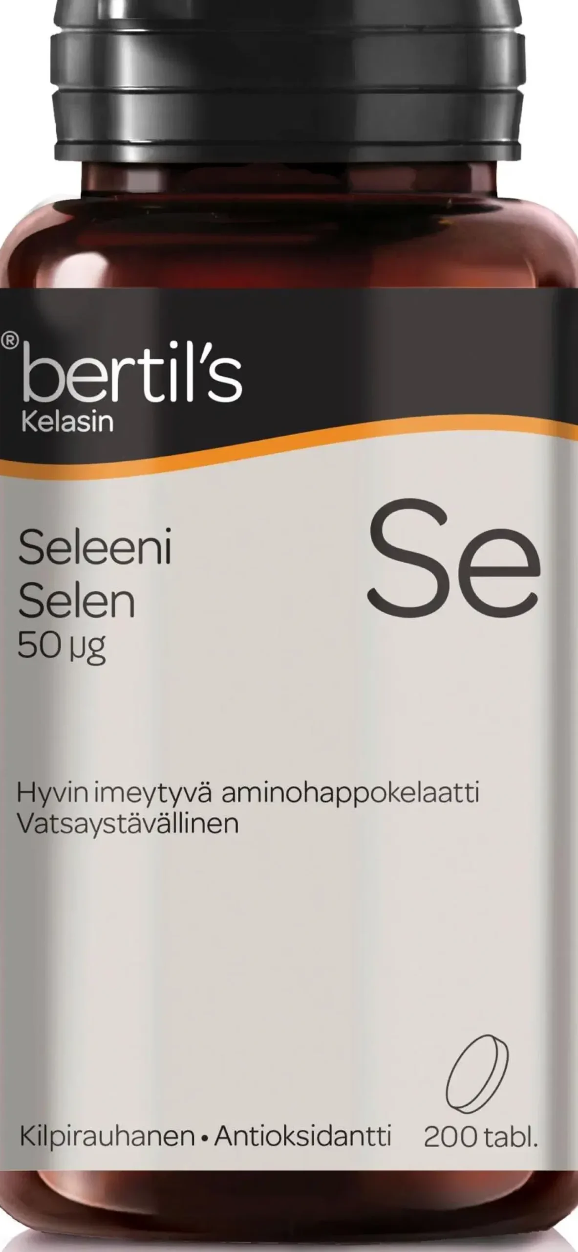 Kotimainen, hyvinimeytyvä bertil´s Seleeni on erinomainen valmiste seleenin saannin lisäämiseen. Seleeniä tarvitaan elimistömme antioksidanttijärjestelmän ylläpitoon. Seleenillä on edullinen vaikutus myös kilpirauhashormonin toimintaan.