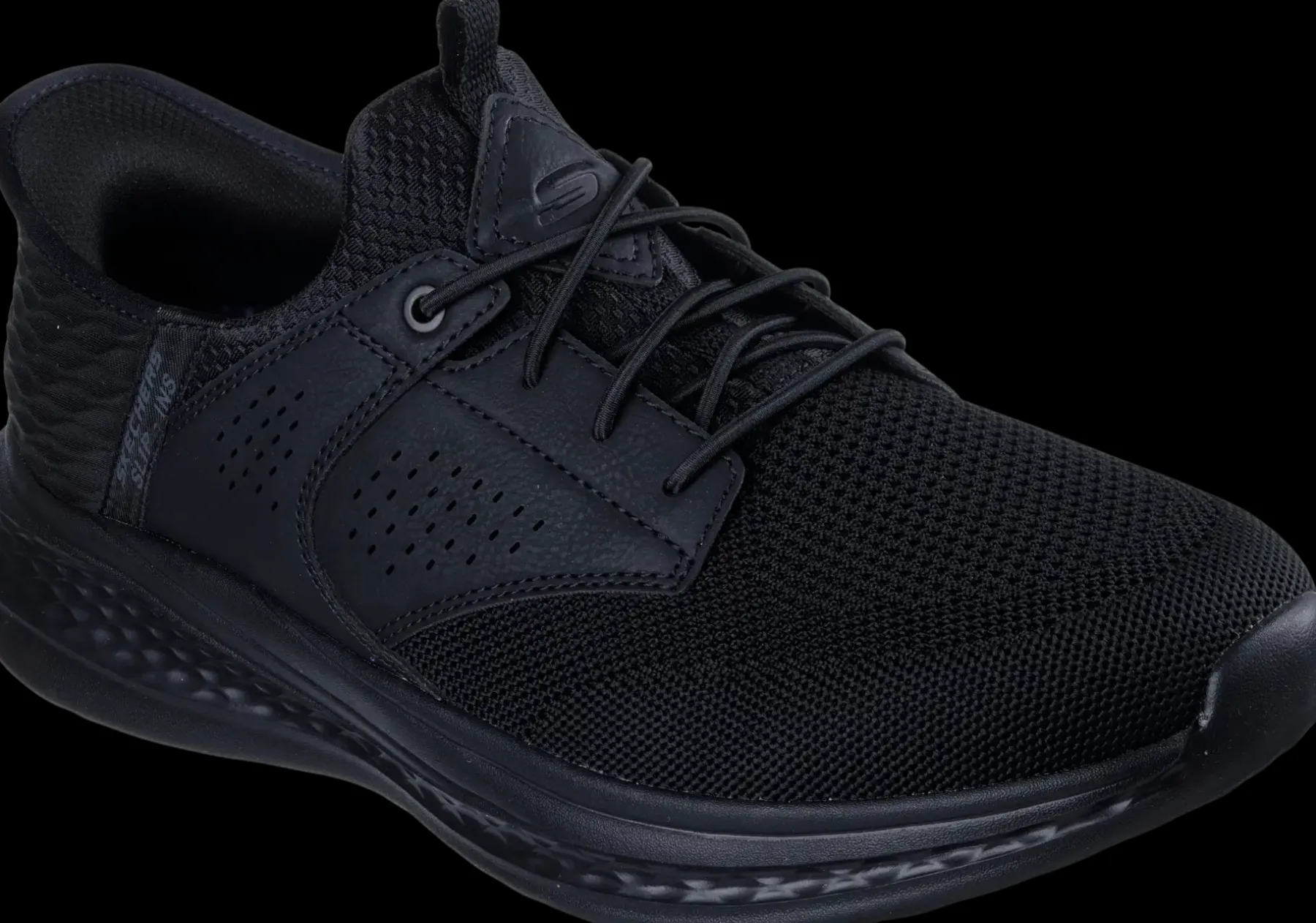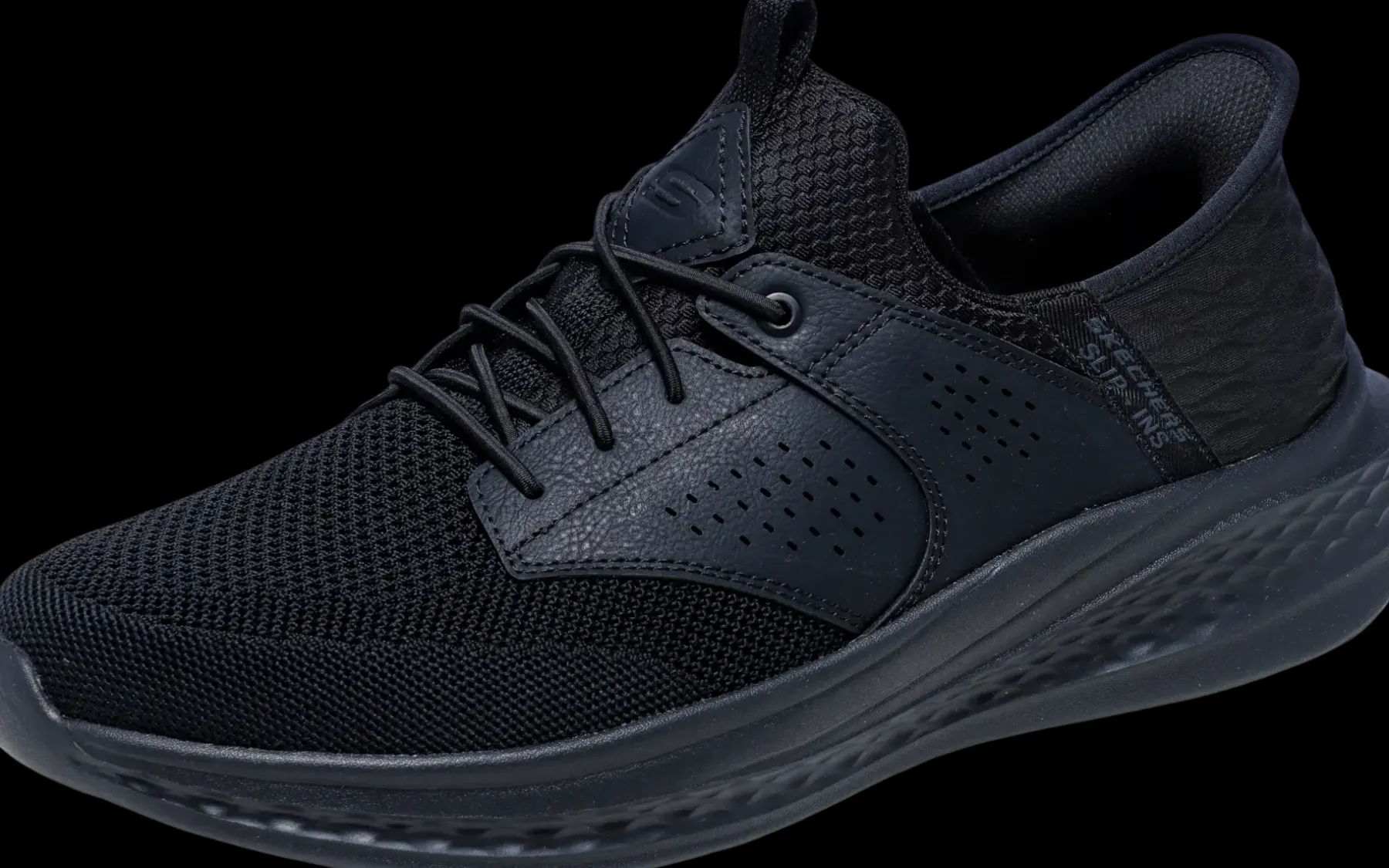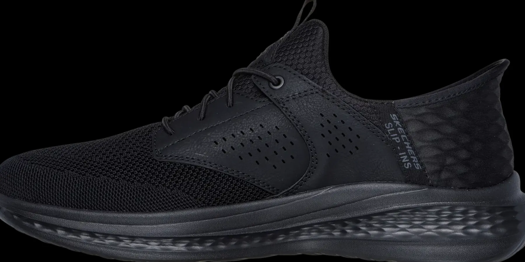 Astu käytännölliseen kävelymukavuuteen Skechers Slip-ins Relaxed Fit: Slade – Caster -kengillä. Tämä kenkä, jossa on ainutlaatuinen Heel Pillow, sisältää mesh- ja synteettisestä materiaalista valmistetun päällisen, hiilikuidulla infusoidun Skechers Air-Cooled Memory Foam -pohjallisen ja Skechers Goga Mat Arch -tuennan.