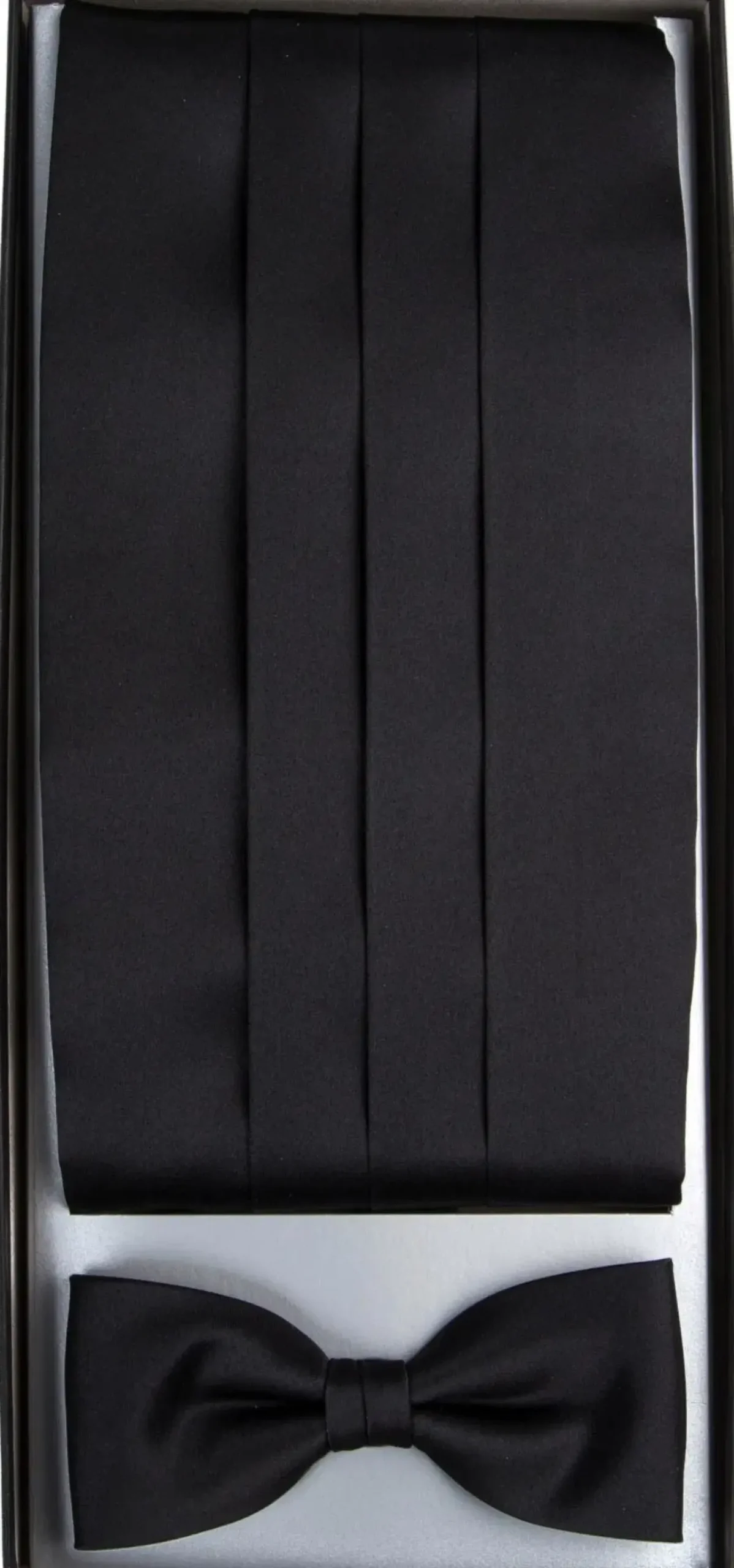 Musta satiinipintainen smokkivyö ja rusetti