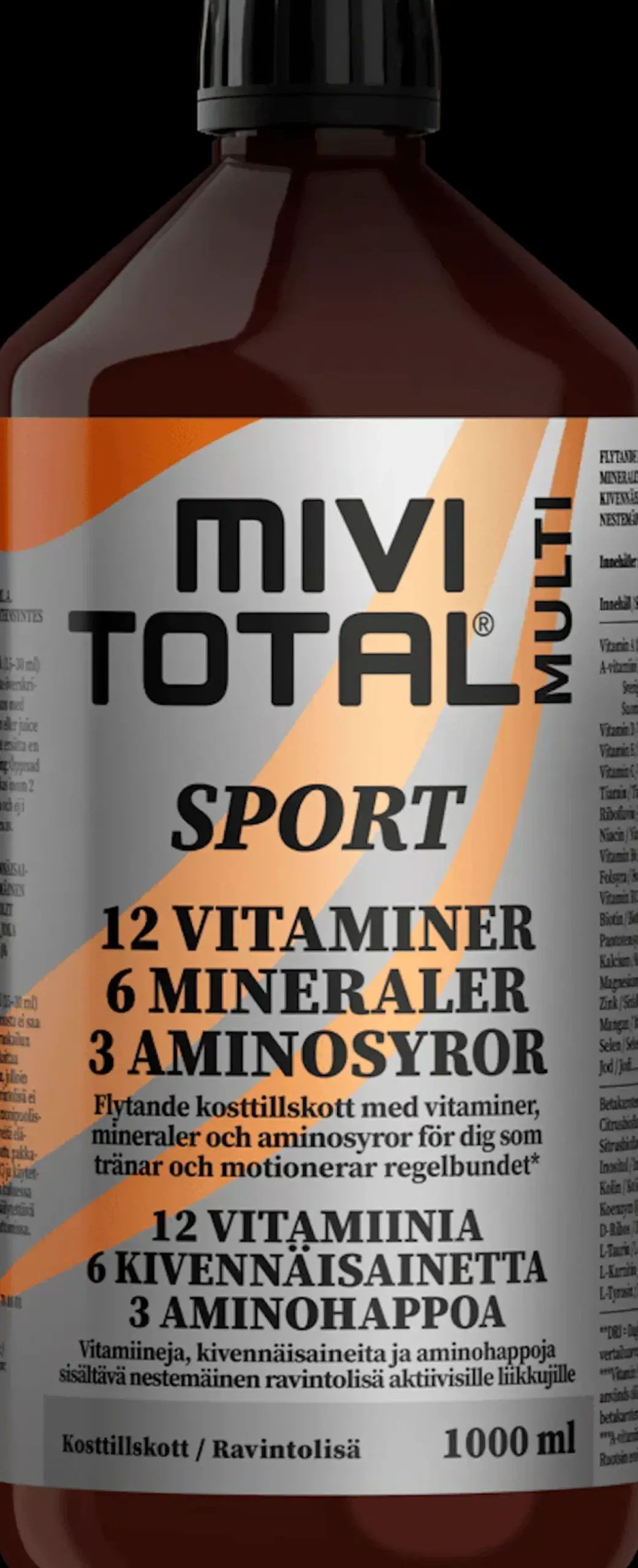 Mivitotal Sport on nestemäinen, helposti nautittava vitamiini- kivennäisainevalmiste aktiivisesti liikkuville. Mivitotal Sport sisältää mm. magnesiumia joka edistää lihasten normaalia toimintaa. Aminohapot täydentävät monipuolista valmistetta. Mivitotal Sport sisältää nestemäisessä muodossa 12 vitamiinia, 6 kivennäisainetta, aminohappoja, koentsyymi Q10:a ja sitrusbioflavonoideja. Ravintolisä ei korvaa monipuolista ja tasapainoista ruokavaliota eikä terveitä elämäntapoja.