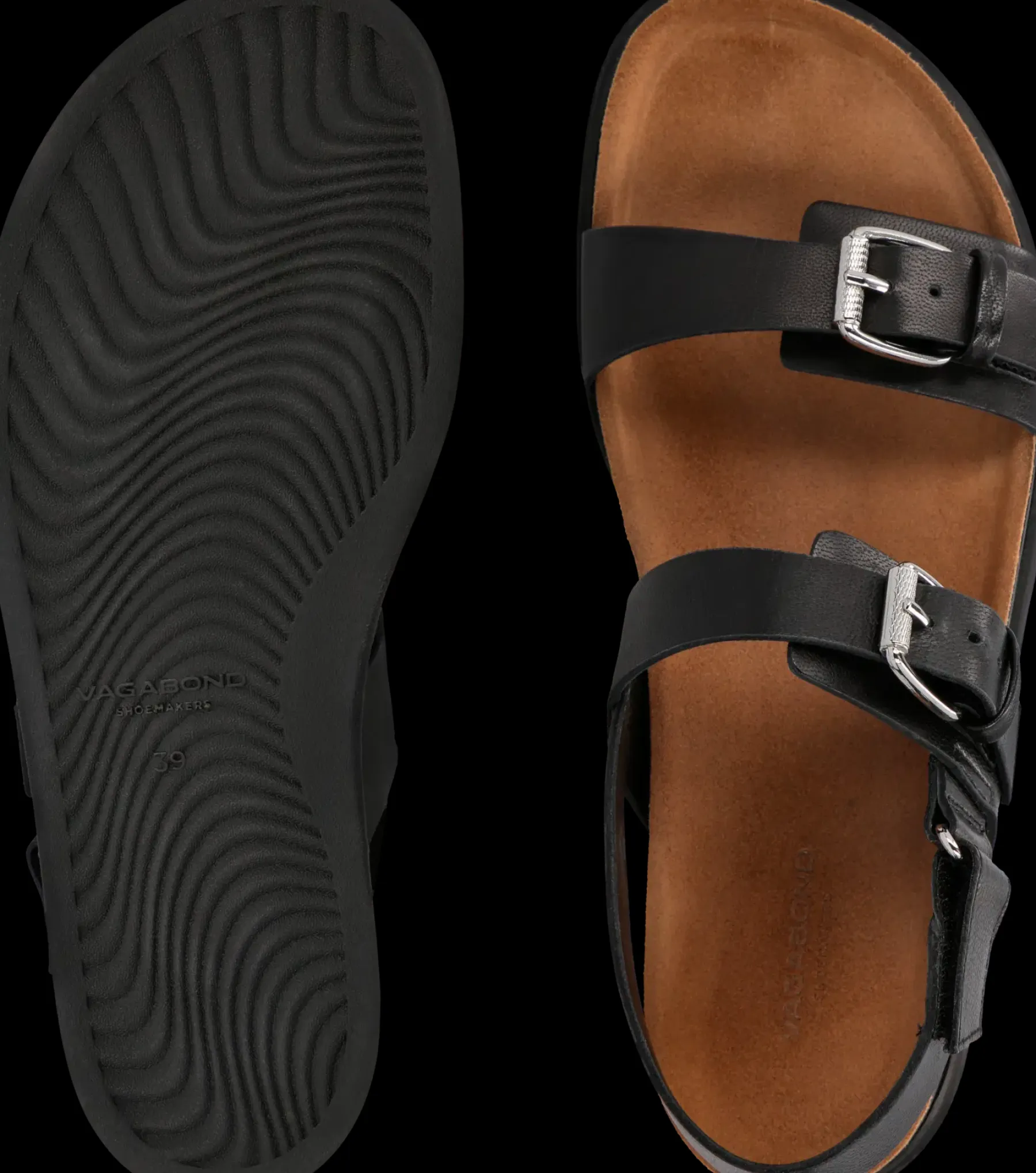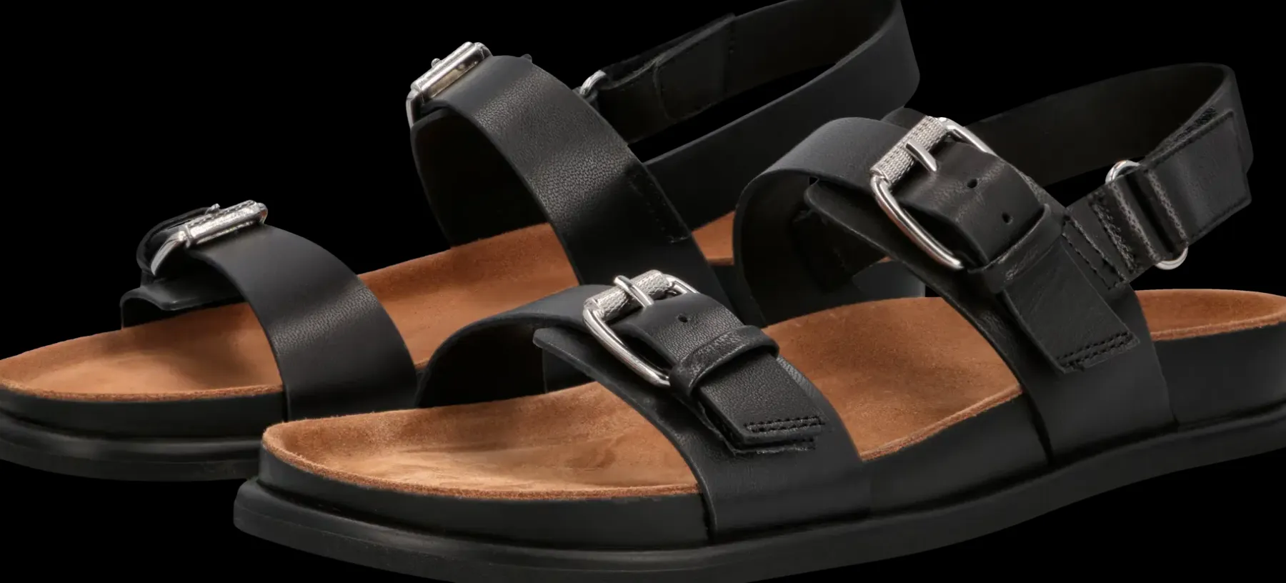 Vagabondin uutuus 2025! Effie-footbed sandaalit ovat erityisen mukavat ja tyylikkäät, helppo yhdistää asuun kuin asuun! Valmistettu mustasta nahasta ja sisäpohja pehmeää mokkanahkaa. Kaikissa remmeissä säätömahdollisuus.