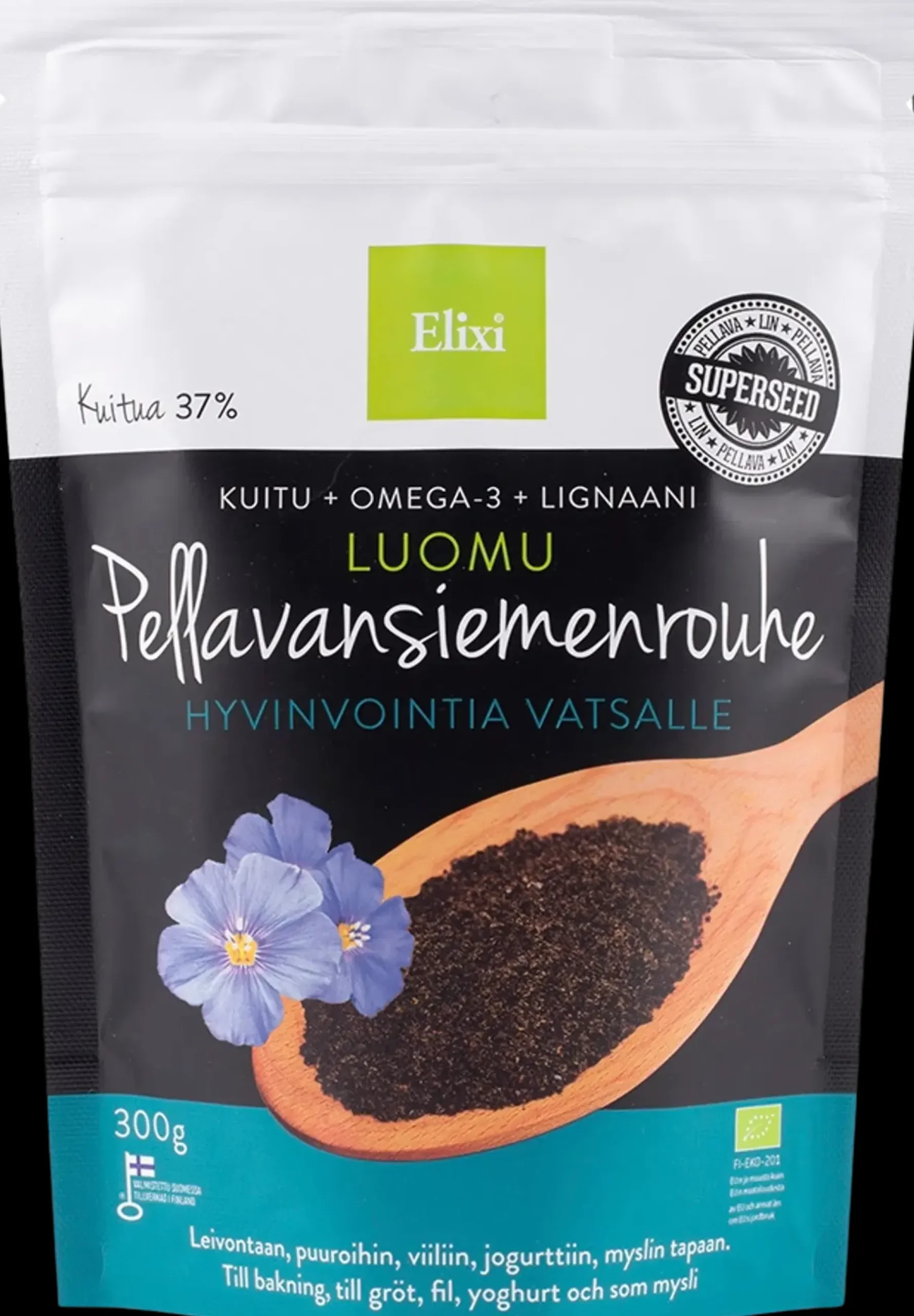Elixi luomu Pellavansiemenrouhe on kotimaassa valmistettua. Elixi Pellavansiemenrouheella autat vatsaasi toimimaan säännöllisesti. Samalla saat myös tärkeitä rasvahappoja, hyvälaatuista proteiinia, kuitua ja kivennäisaineita. Sopii esimerkiksi jugurttiin, puuroon, leivontaan tai smoothien joukkoon. Päivittäinen saantisuositus 1-2rkl.