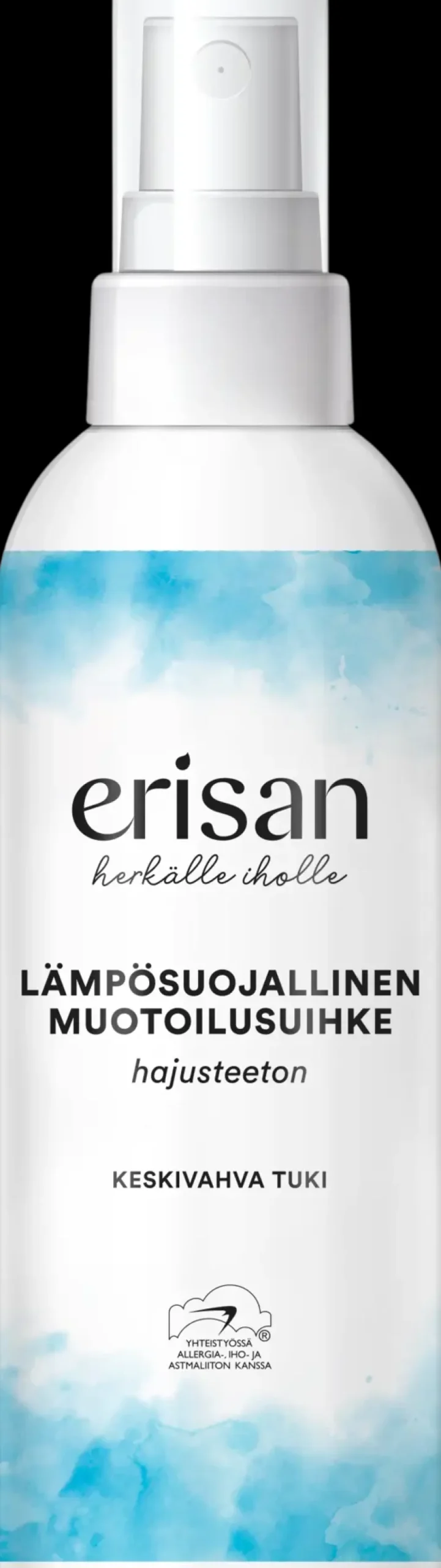 Hajusteeton Erisan Lämpösuojallinen Muotoilusuihke antaa hiuksiin keskivahvan ja joustavan pidon sekä suojaa hiuksia lämpökäsittelyn aikana. Vähentää sähköisyyttä antaen hiuksille volyymia ja kauniin kiillon. Sopii myös herkälle hiuspohjalle. Ei sisällä hajusteita eikä väriaineita.