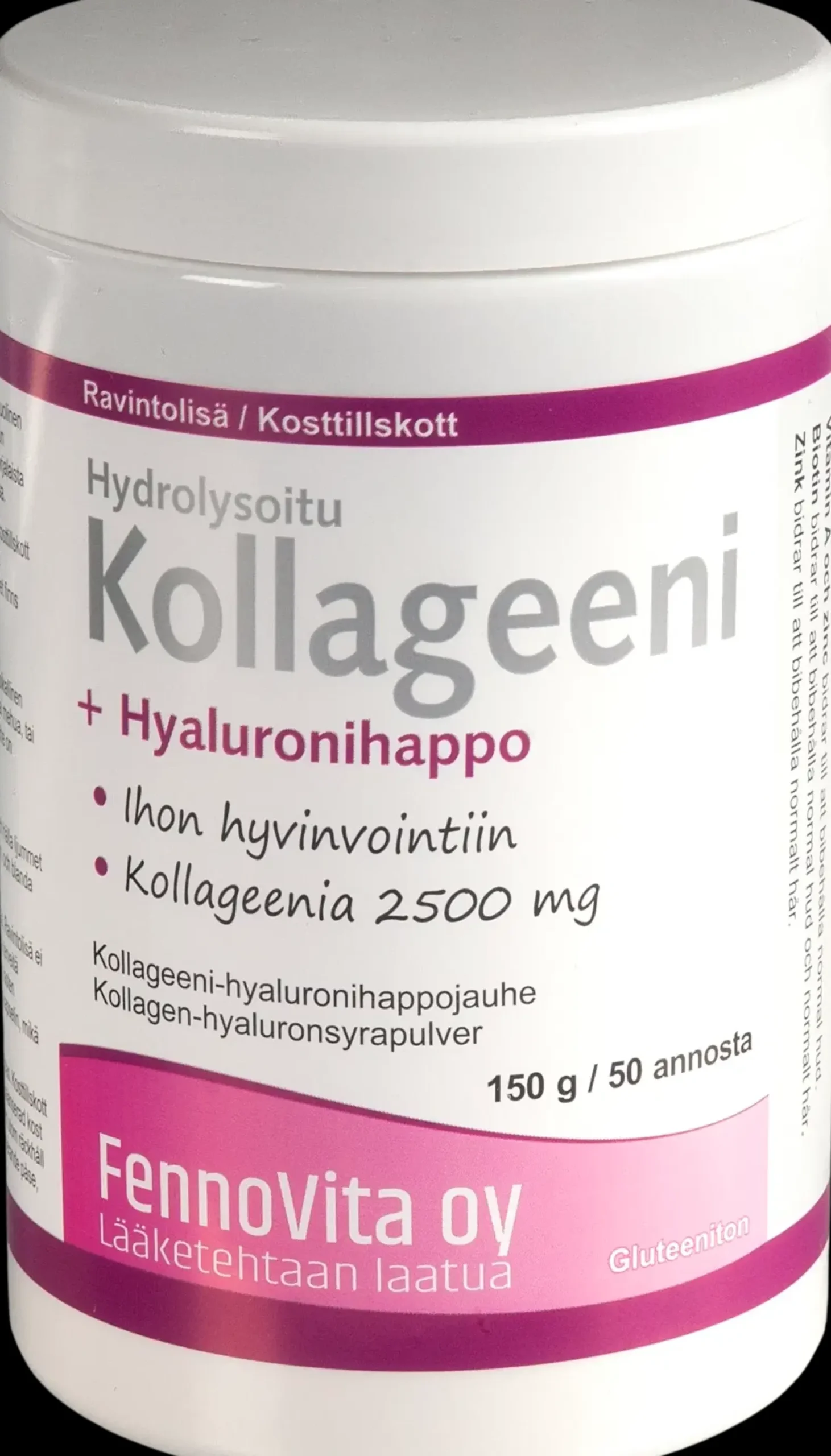 Fenno Vitan kollageeni + hyaluronihappo on hyvin monipuolinen ravintolisä iholle ja hiuksille. Kollageenin lisäksi tuotteessa on hyaluronihappoa ja kolmea iholle tärkeää ravintoainetta. Norjalaista kalaperäistä kollageenia on 2500 mg vuorokausiannoksessa.