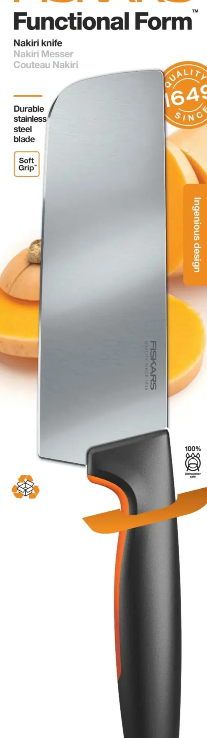 Aasialaistyylinen yleisveitsi leveällä terällä on ihanteellinen suurten kasvisten pilkkomiseen. Terä on valmistettu lujasta japanilaisesta ruostumattomasta teräksestä ja veitsen turvallisessa ja ergonomisessa kahvassa on syvä sormisuoja. Kaikki Fiskars Functional Form -veitset ovat konepestäviä.