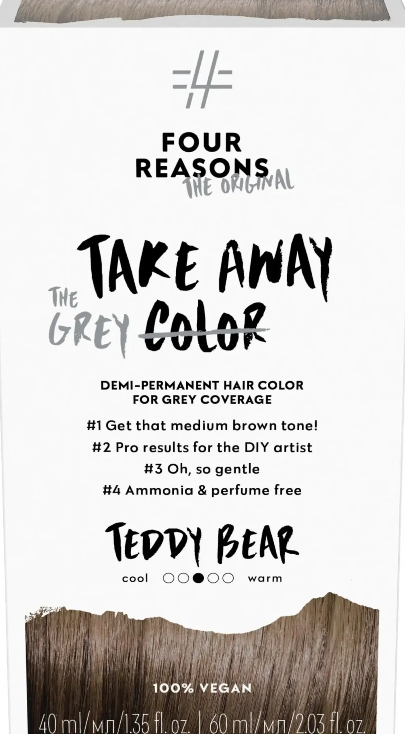 Takeaway Color on ammoniakiton ja hajusteeton kestosävyte, joka peittää harmaat hellävaraisesti, helposti ja varmasti. Väristä tulee eloisa, vivahteikas ja erittäin kiiltävä. Ainutlaatuinen koostumus mahdollistaa täyteläisen, ajan myötä kauniisti pehmentyvän lopputuloksen.