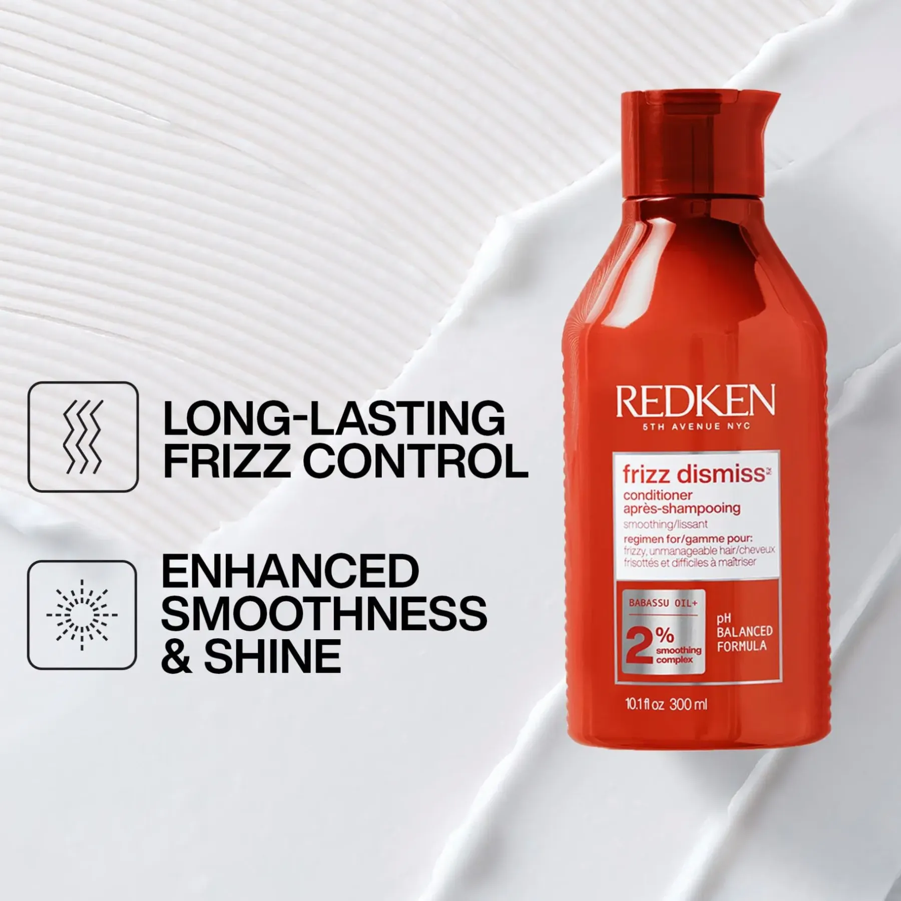 Redken Frizz Dismiss Conditioner on anti-frizz hoitoaine. Se kesyttää pörröisiä hiuksia, parantaa niiden käsiteltävyyttä ja korostaa hiusten kiiltoa. Tämä hoitoaine sisältää Redkenin Smoothin Complex -ainesosayhdistelmän ja solidaarisesti tuotettua babassuöljyä. Se selvittää hiuksia ja suojaa niitä pörröisyyttä vastaan samalla, kun se tekee hiuksista pehmeämmät ja kiiltävämmät.