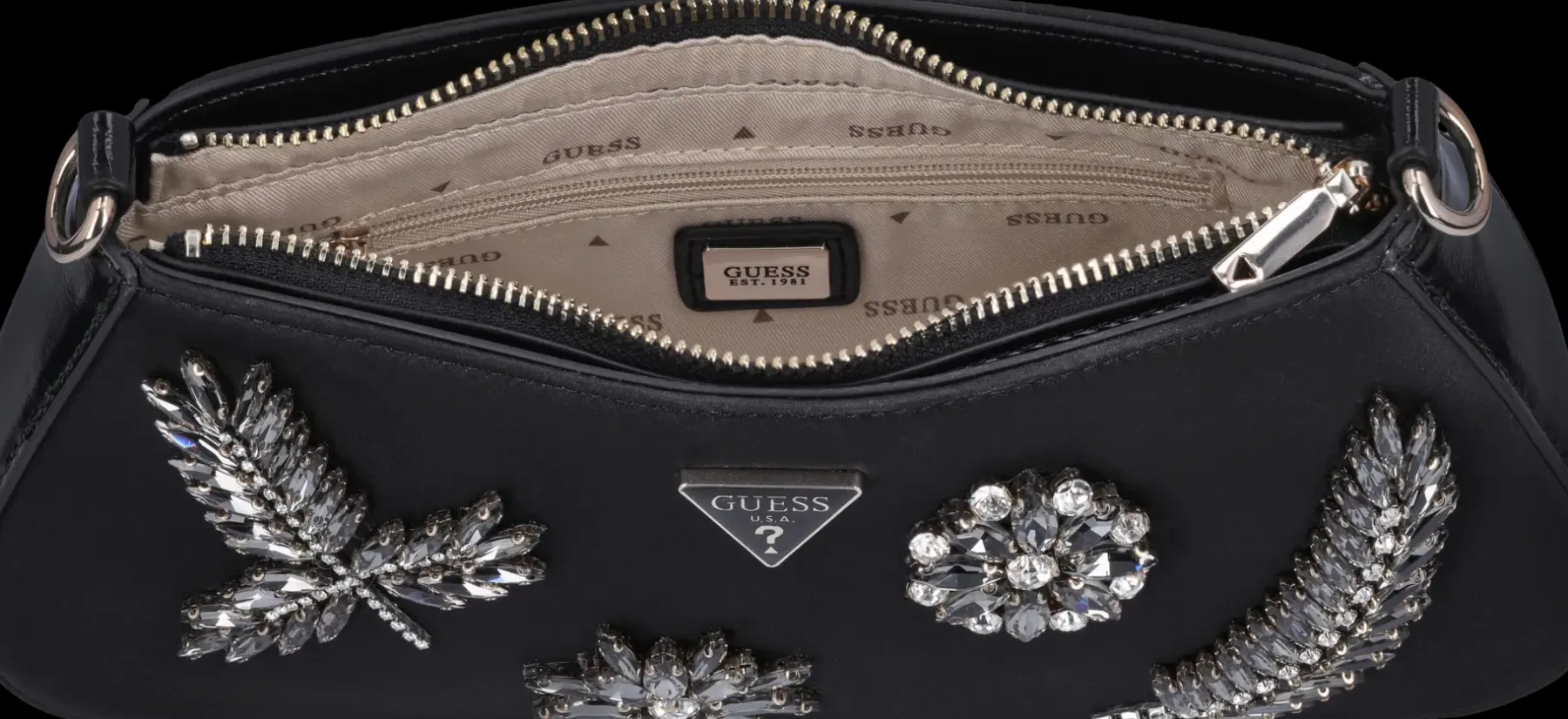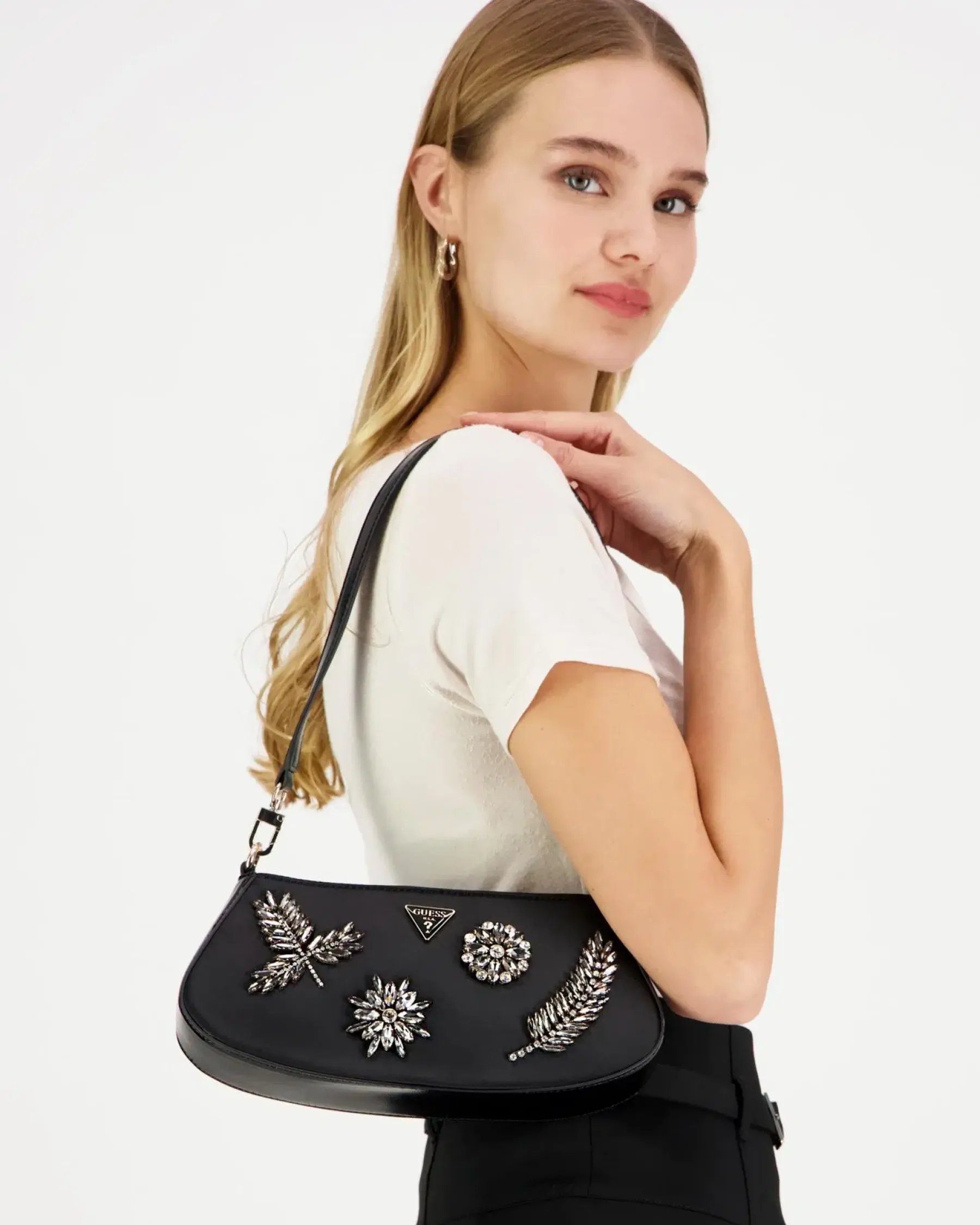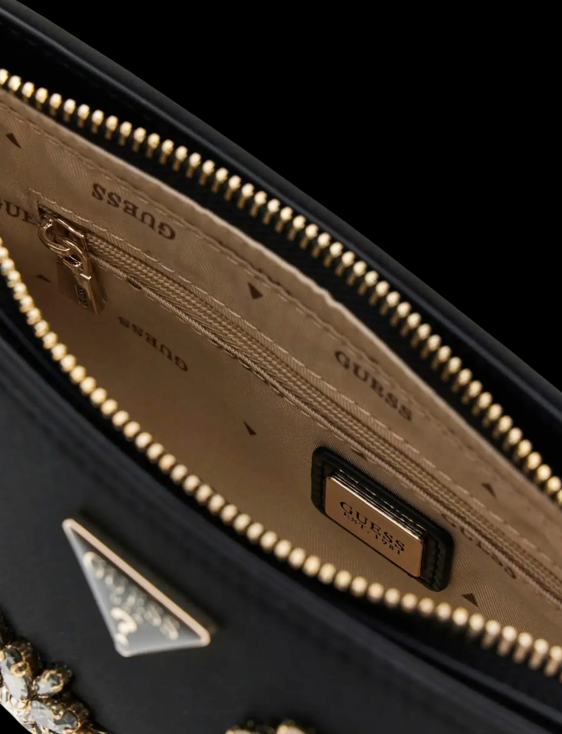 Nylonpintainen pieni näyttävä pikkulaukku. Kantohihna irroitettavissa. Laukku aukeaa vetoketjulla ja sisältä löytyy korttitaskuja ja pieni vetoketjutasku.