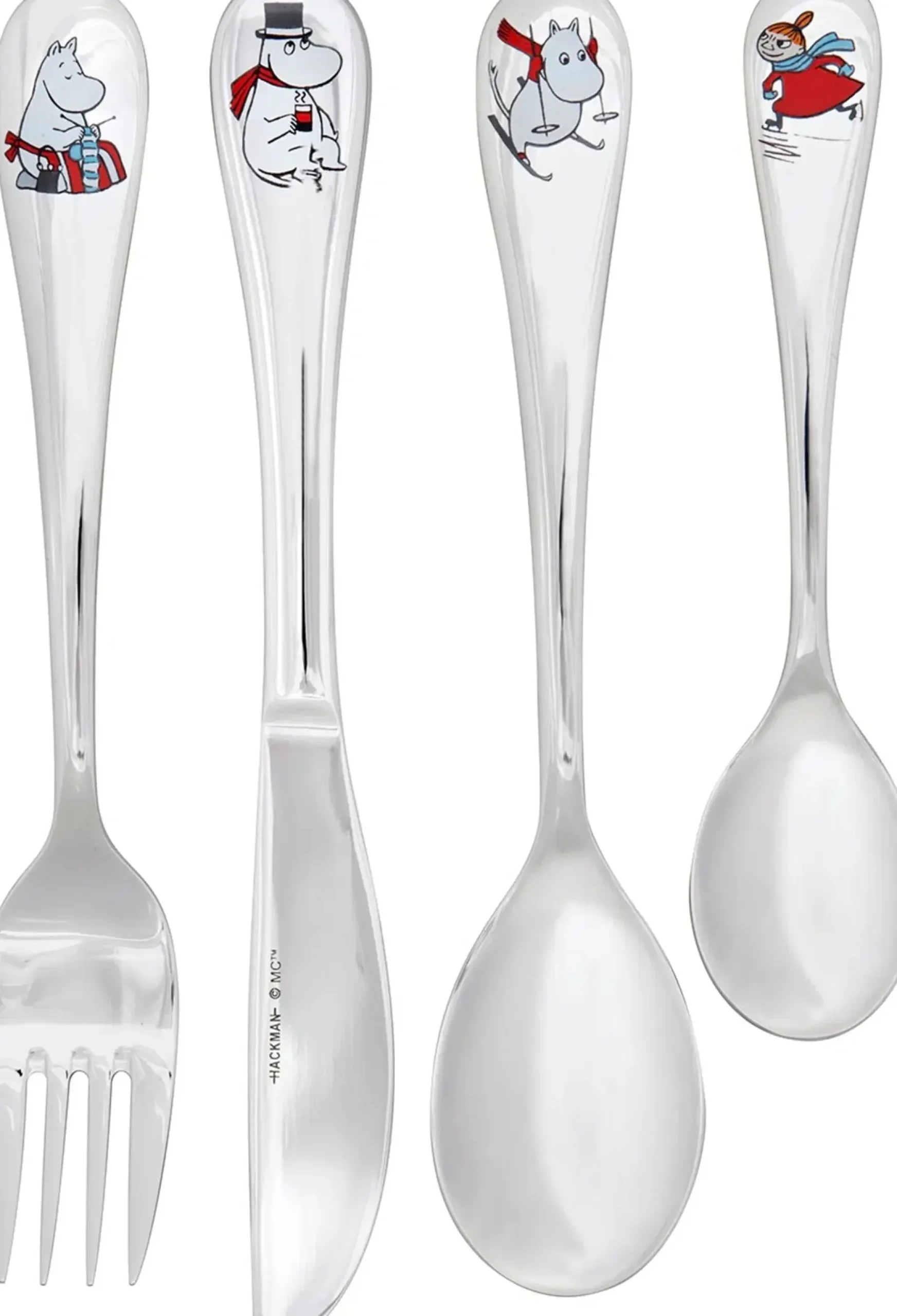 Muumi Talvi-aterinsetti sisältää lasten haarukan, veitsen, ruokalusikan sekä kahvilusikan. Aterinten pituus n. 17 cm, kahvilusikan pituus 13,4 cm. Aterimissa 4 eri hahmoa talvisissa touhuissa: Muumimamma, Muumipappa, Muumipeikko ja Pikku Myy. Ruostumatonta terästä.