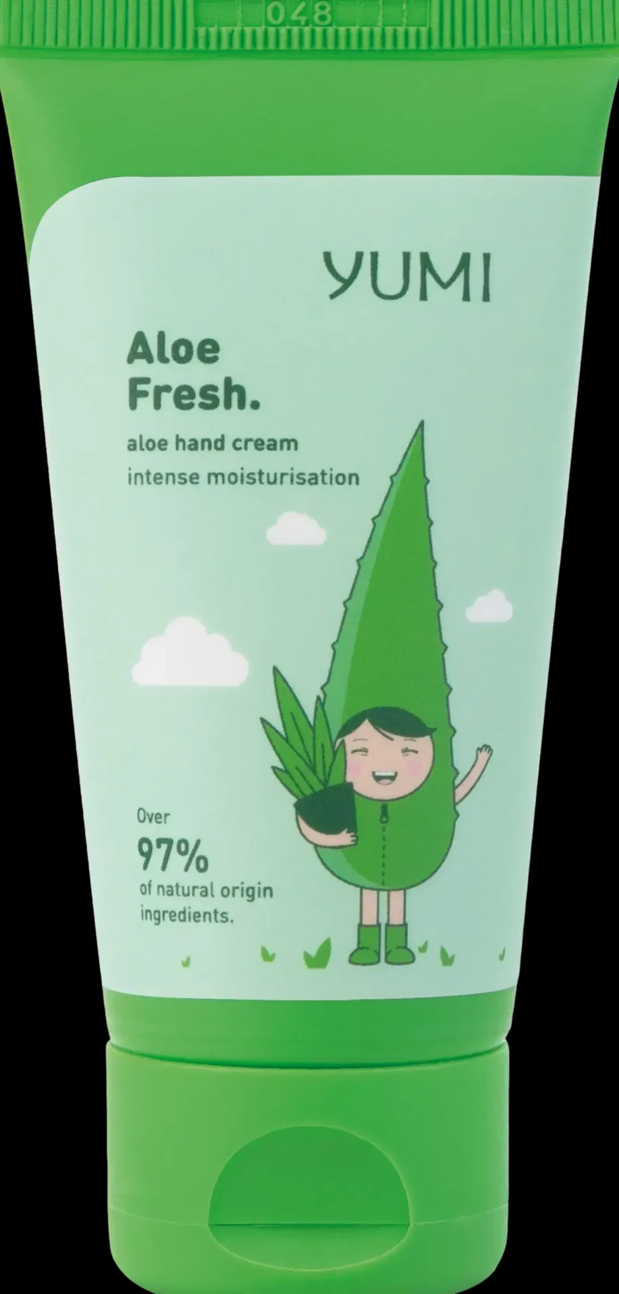 Yumi Aloe vera käsivoide on täydellinen tuote janoiselle iholle. Yumi-käsivoide yhdistää tehokosteuttavan 99 % aloemehun tarkoin valituihin ihoa hoitaviin ainesosiin. Täyteläinen 97 % luonnollinen koostumus kosteuttaa kaikkein vaativintakin – kuivaa ja ärtynyttä – ihoa. Aloe rauhoittaa ja kosteuttaa ihoa. Sheavoi uudistaa ihoa. Manteli- ja kookosöljyt ravitsevat ihoa. E-vitamiini suojaa ihoa vapailta radikaaleilta. Urea syväkosteuttaa ja pehmentää ihoa. Allantoiini uudistaa ja hoitaa ihoa. Tuloksena silkinpehmeät ja hyvinvoivat kädet, jotka tuoksuvat herkulliselle! Raaka-aineista 97 % luonnollista alkuperää olevia. Tuote on 100 % vegaaninen.
