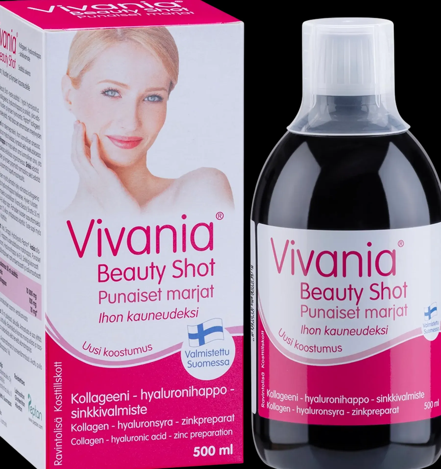 Vivania Beauty Shot -neste sisältää 1. tyypin hydrolysoitua Peptan® kollageenia, hyaluronihappoa ja sinkkiä, joka edistää ihon, hiusten ja kynsien hyvinvointia. Peptan® kollageeni on pienimolekyylistä, mikä takaa sen erinomaisen imeytyvyyden. Kollageeni on rakenneproteiini, ihon luonnollinen ainesosa. Kollageenia on myös hiuksissa, kynsissä sekä nivelkudoksessa. Hyaluronihappo on myös kehon oma luonnollinen aine, jota esiintyy kaikissa elollisissa organismeissa. Sinkki edistää ihon, hiusten ja kynsien pysymistä normaalina sekä edistää solujen suojaamista hapettumisstressiltä. Ikääntymisen myötä elimistön kyky valmistaa kollageenia kuten myös hyaluronihappoa heikkenee. Hyvien tulosten saavuttamiseksi suositellaan Vivania Beauty Shottia 50 ml päivittäin 4-8 viikon ajan. Parhaiden tulosten saavuttamiseksi suositellaan 12 viikon yhtäjaksoista käyttöä. Tuote sopii myös jatkuvaan käyttöön.
