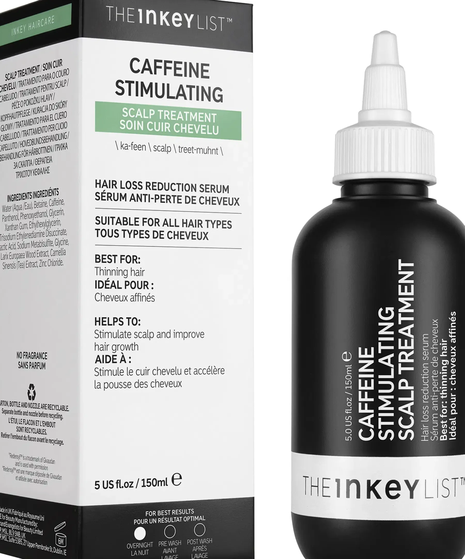 Yön yli jätettävä päänahan hoitoaine, joka sisältää kofeiinijauhetta ja Redensyliksi™ kutsuttua ainesosaa, joka auttaa vähentämään hiusten lähtöä stimuloimalla päänahkaa ja karvatuppea ja siten edistää hiusten kasvua ja auttaa tekemään hiuksista paksummat.
